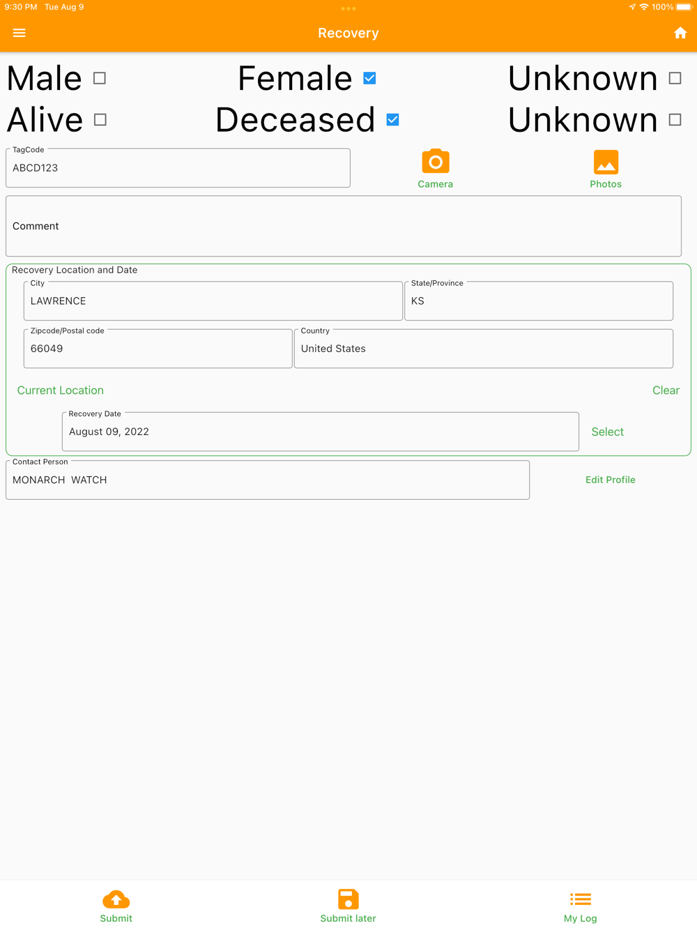 All data from tagging, recovery, and calendar projects are saved on your device, giving you a record of what you have submitted.