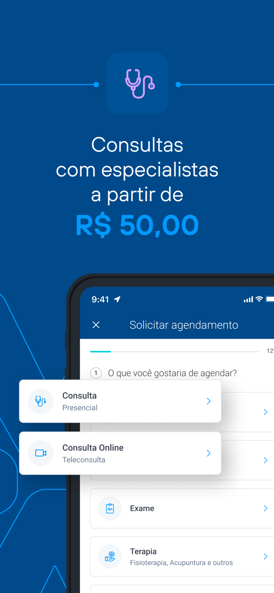 Mais de 60 especialidades disponíveis: você marca consultas com os melhores profissionais, entre clínicos gerais, cardiologistas, pediatras, ginecologistas, psicólogos, enfermeiros, nutricionistas, entre outros;