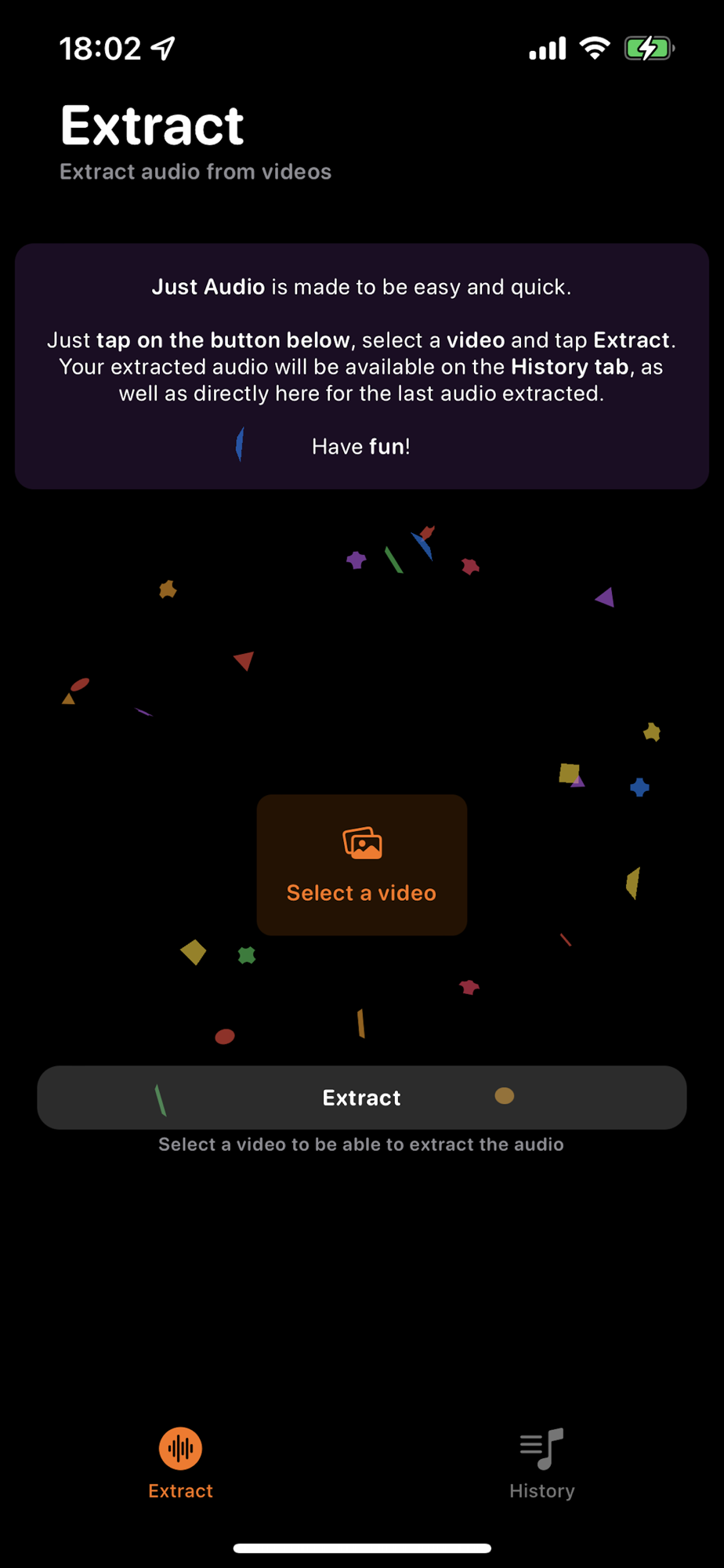 Just Audio is made to be easy and quick. Just select a video from your gallery that you want to extract the audio and... it's done! Your extracted audio will be available on the History tab, with all the possibilities of playing the audio, making it a favorite and sharing wherever you want or need. Just as simple as tapping a button, also having the possibility of sending as an audio message.