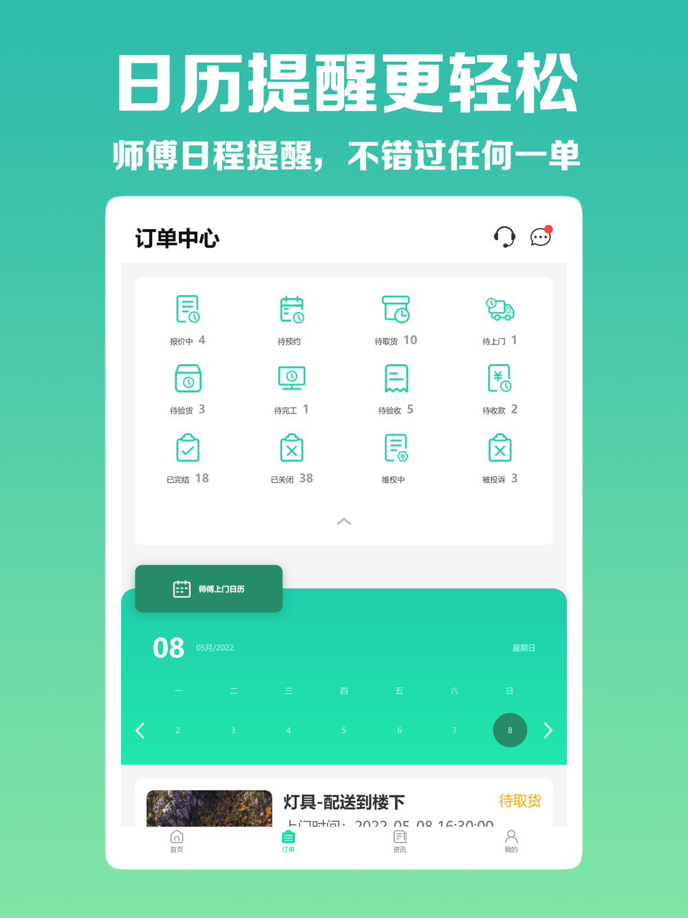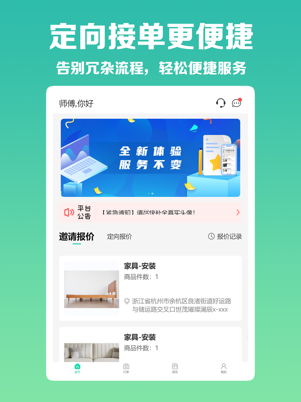 平台在合理监管以及明确订单信息的前提下给师傅更多的选择权利与经营空间;平台操作简单便捷,无需繁琐步骤,让师傅轻松上手。