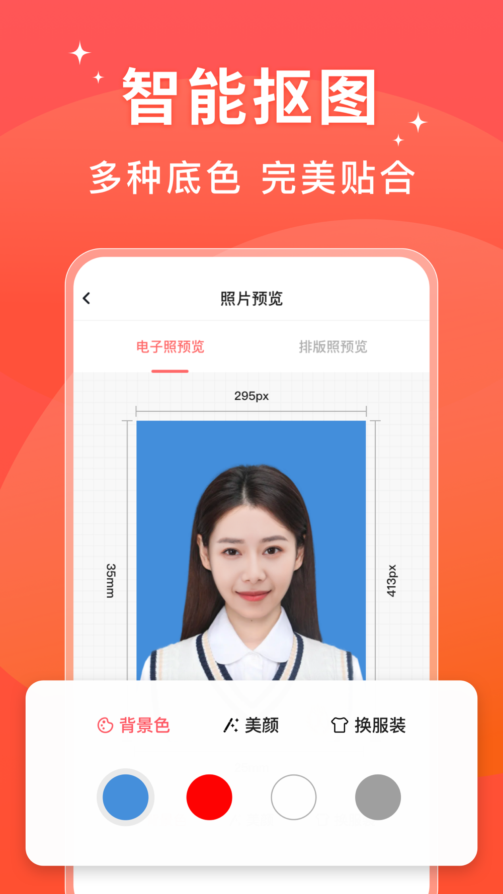 【一键换底,多种底色免费更换】 智能图像处理算法,抠图精确到每根头发丝。避免边缘模糊粗糙等问题,系统一键更换底色,省事又省力~除了常规的红蓝白底,还包含当下热门的高级色和糖果色,可根据要求随意切换,保障您美丽的同时,轻松搞定各类证件照的报名审核。