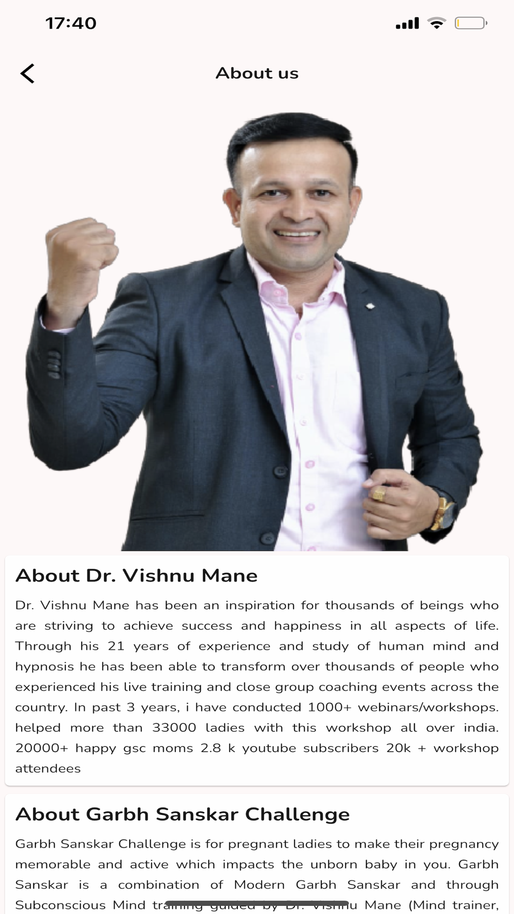 Garbh Sanskar Challenge is an app only made for pregnant ladies to make their pregnancy memorable and active which impacts the unborn baby in you. Garbh Sanskar App is a combination of Modern Garbh Sanskar and through Subconscious Mind training guided by Dr. Vishnu Mane (Mind trainer, Life and Parenting Coaching who has over 21 years of experience. Garbh Sanskar Challenge is a family of thousands of proud GSC Moms