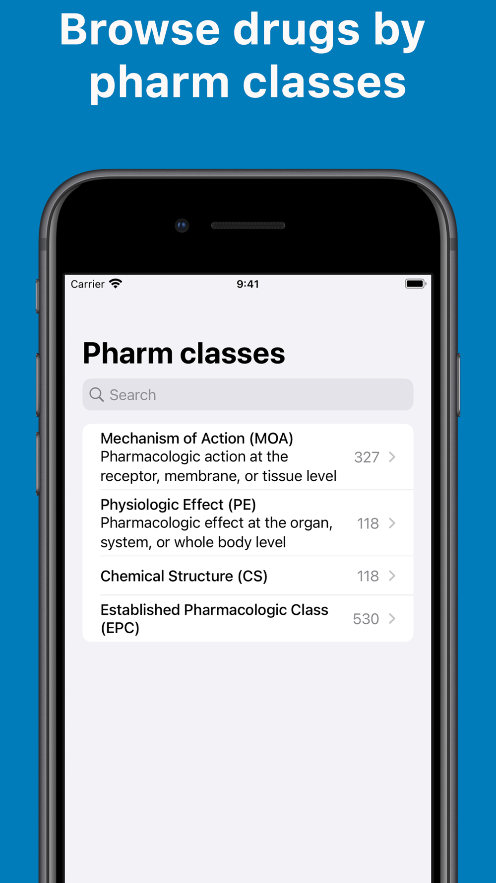 - access to all current features and info about pharm classes (by mechanism of action [MoA] or established pharmacologic class [EPC]) each medicine;