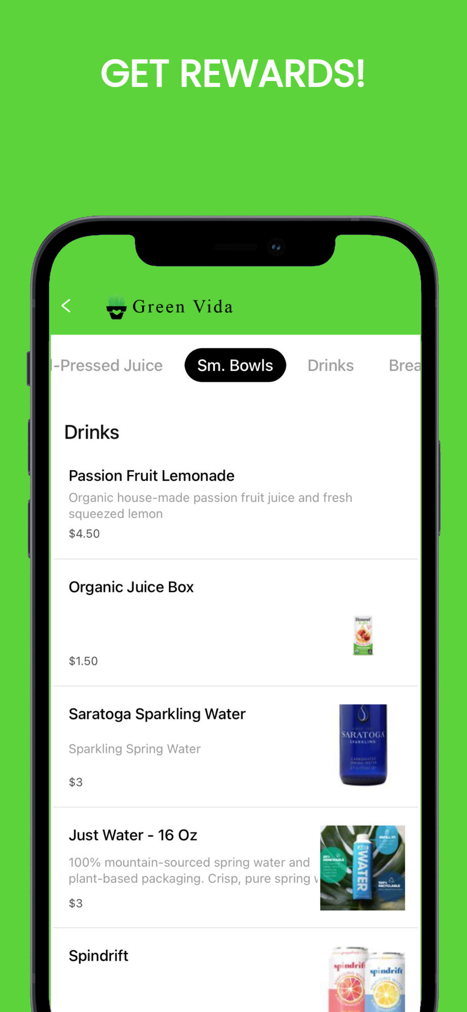 The Green Vida app is a convenient way to pay in store or skip the line and order ahead. Rewards are built right in, so you'll collect points and start earning free food and discounts with every purchase.
