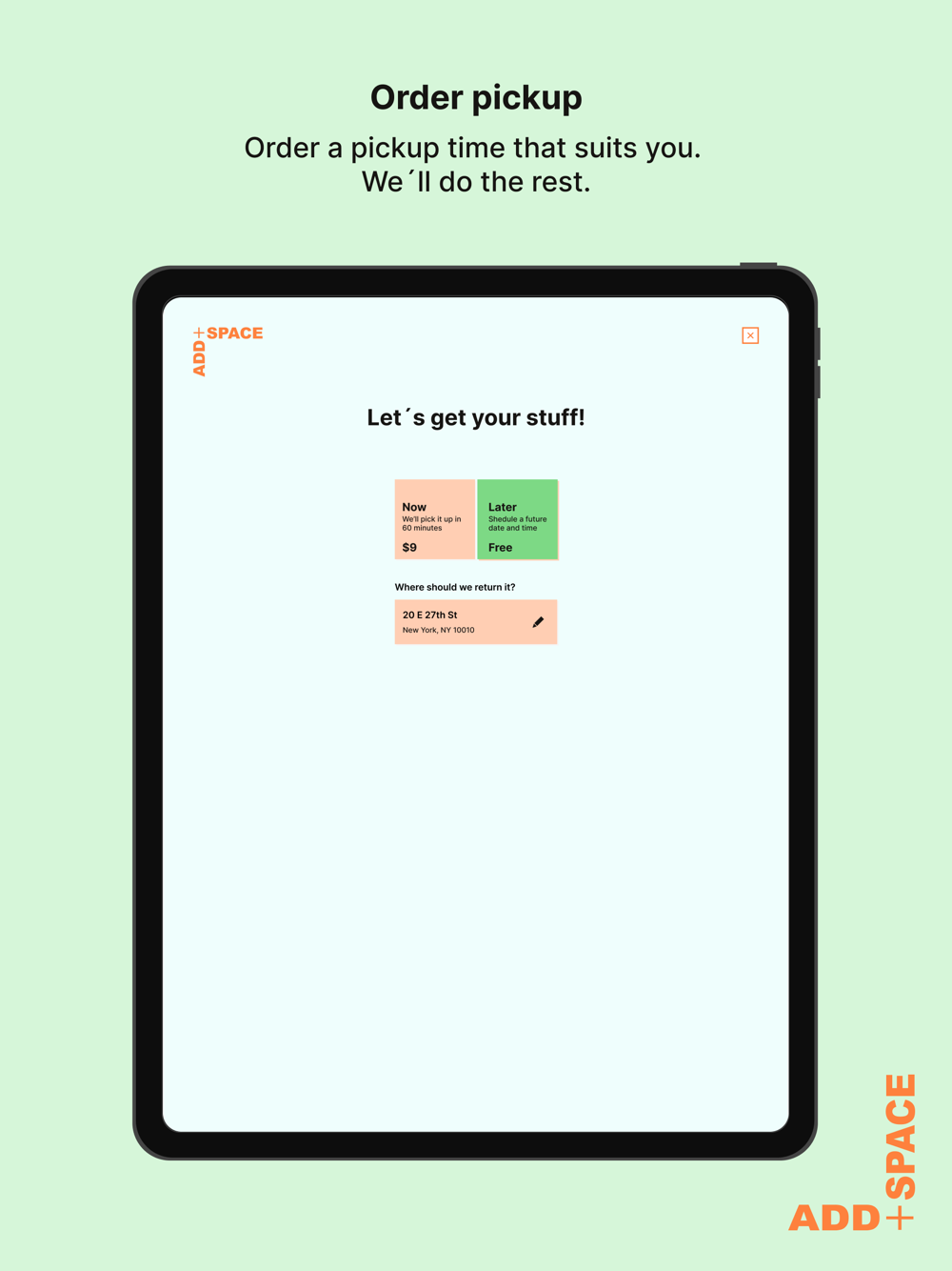 ADD + SPACE is a total hassle-free personal storage solution, equipped with AI technology and picture recognition. Take photos of the items you want to store, and the app automatically tags it and creates a virtual closet for you on your phone. Then just order pickup and ADD + SPACE will pick up your belongings and store them in a safe, nearby facility. As easy as ordering an Uber! Need something back? Just browse through your pictures, select the items and we’ll be at your doorstep before you even know it.