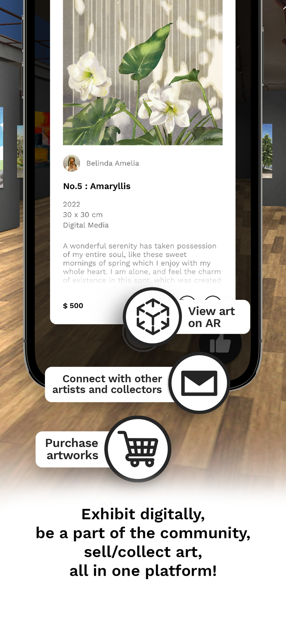 Showcase your artworks virtually, make your art augmentable for easy life-size visualization, link your web store, exhibit your NFT arts, and more!