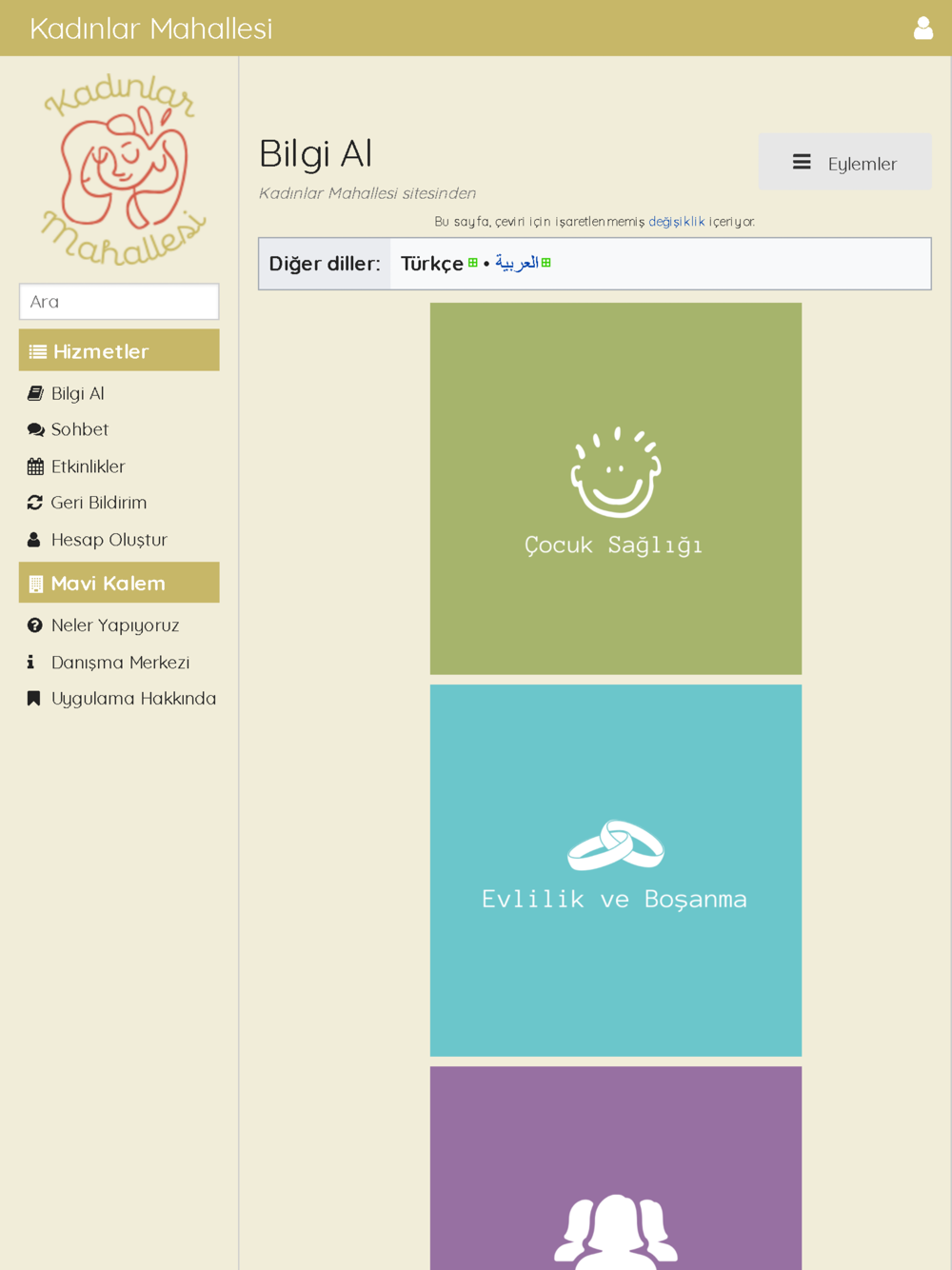Ayrıca Kadınlar Mavi Kalem Kadın Danışma Merkezi etkinliklerini takip edebiliyor ve haberdar olabiliyor.