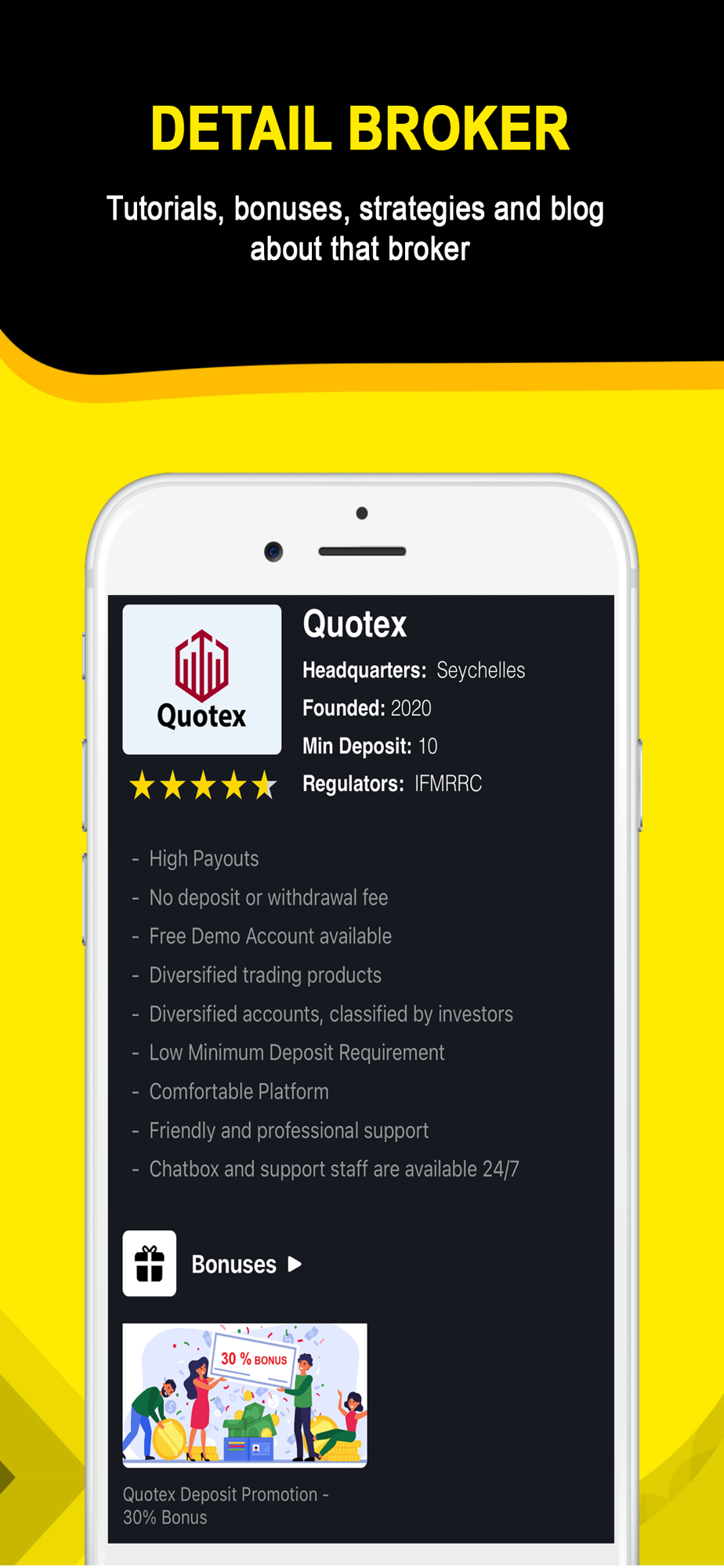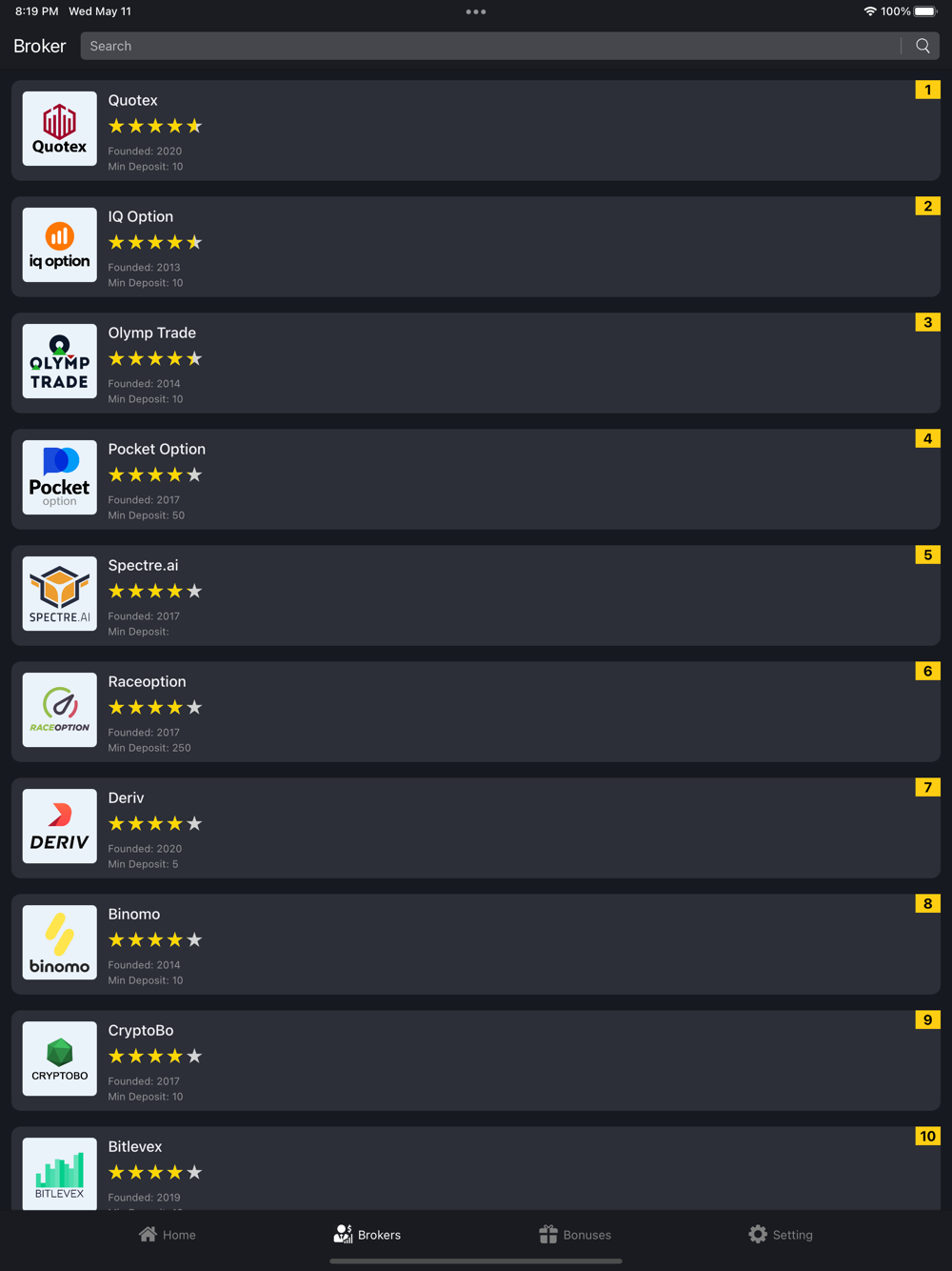 Binary Option is the app provide for users to inquire whether a broker is formal, legal and real. It provides all-round service including broker's information, regulation, license, risk exposure... it will help you to choose the best suitable broker for own trading needs.