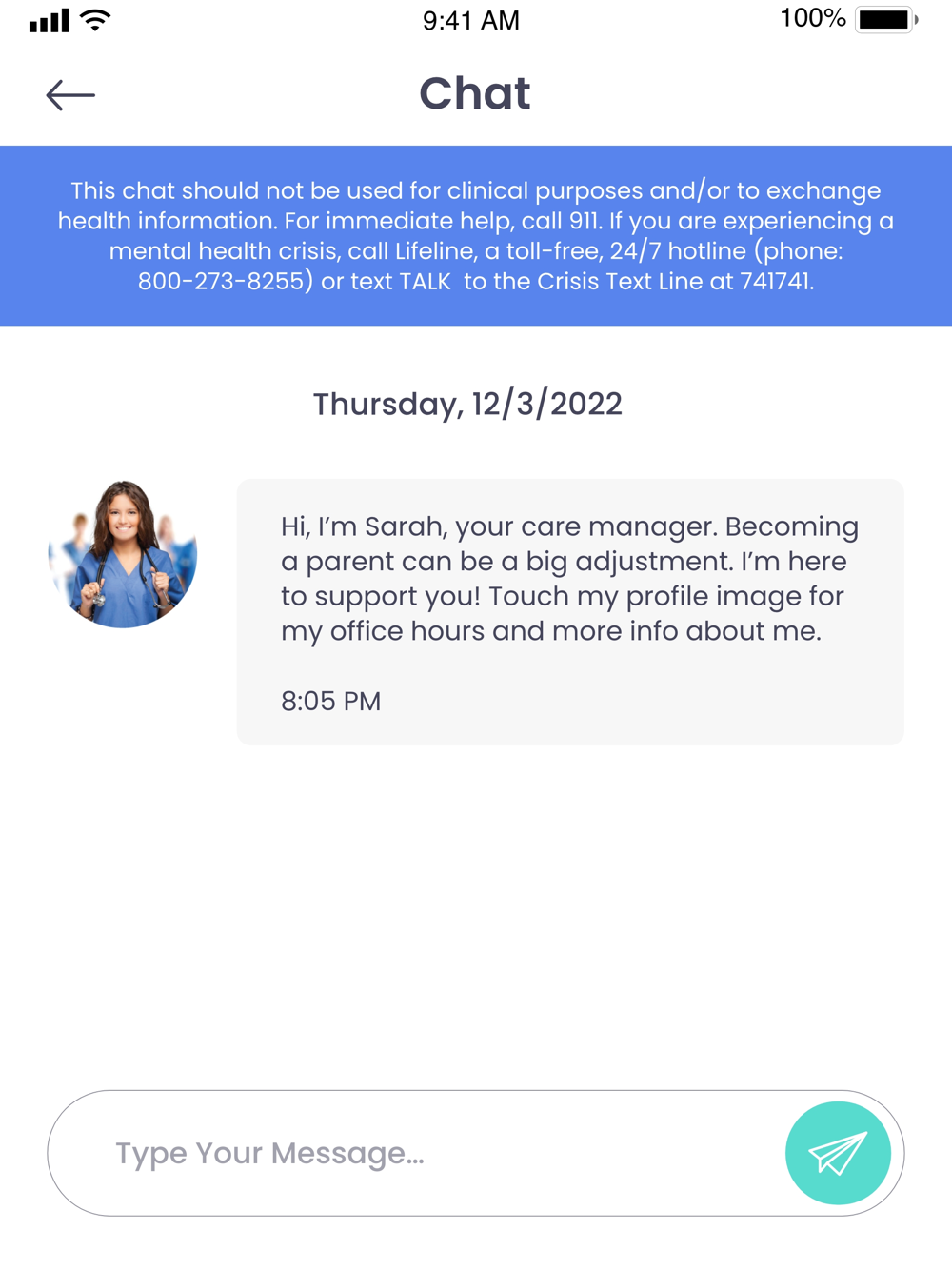 Real-person, instant support is easy to access on the BABY2HOME app. Chat with your own care manager, a trained professional who is there to support you through the ups and downs of being a new parent. You are not alone!