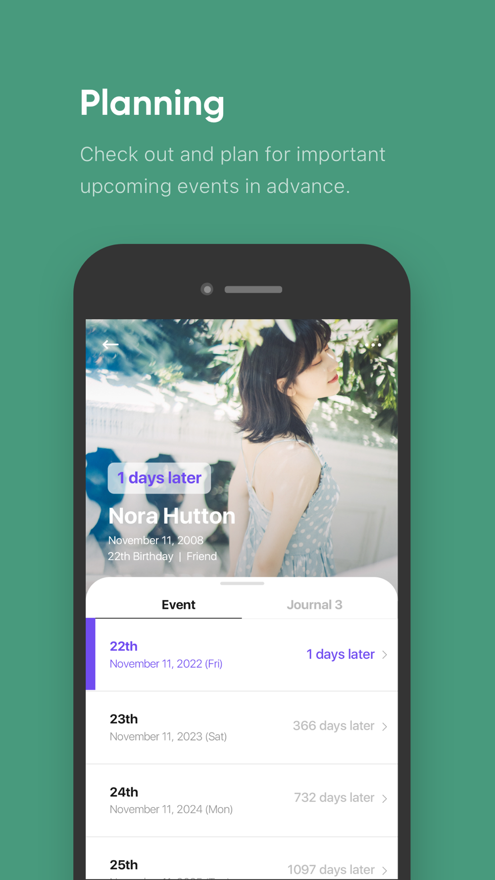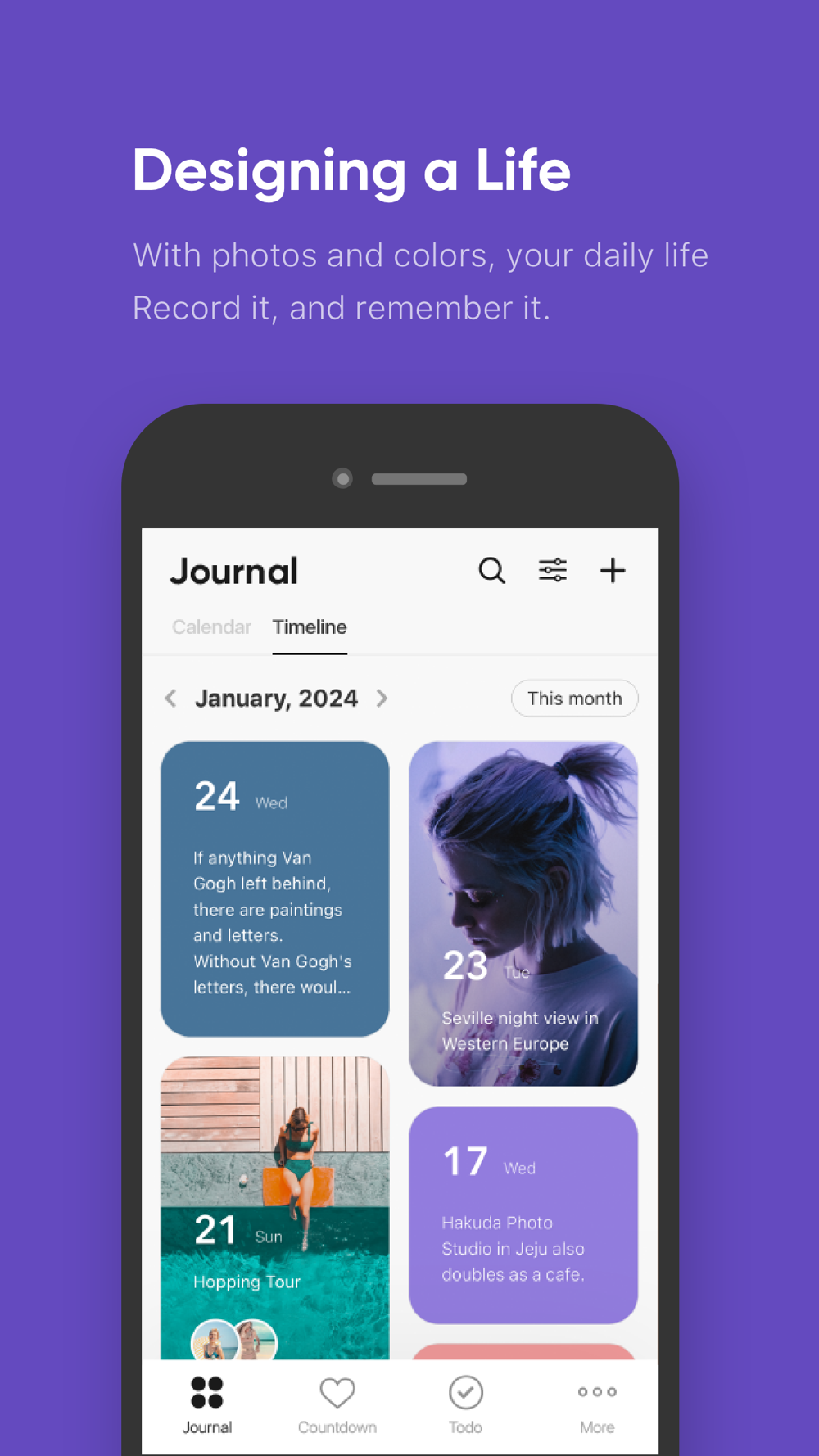 You can see important memories and emotions of this month at a glance through the calendar view and timeline view. And, since you can link journals to events, it is convenient to recall memories for each event.