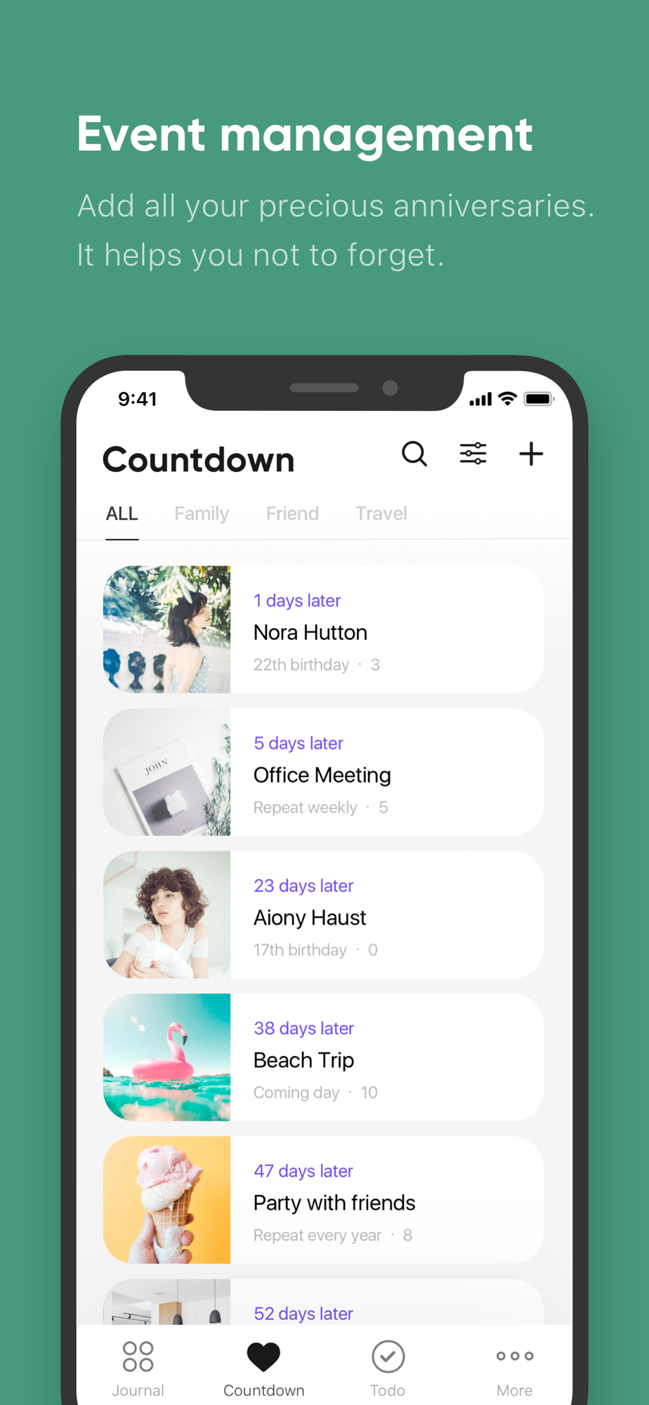 • Various countdown types are provided. (Birthday, anniversary, number of days left, number of past days, repeat every year, repeat every month, repeat every week, etc.)