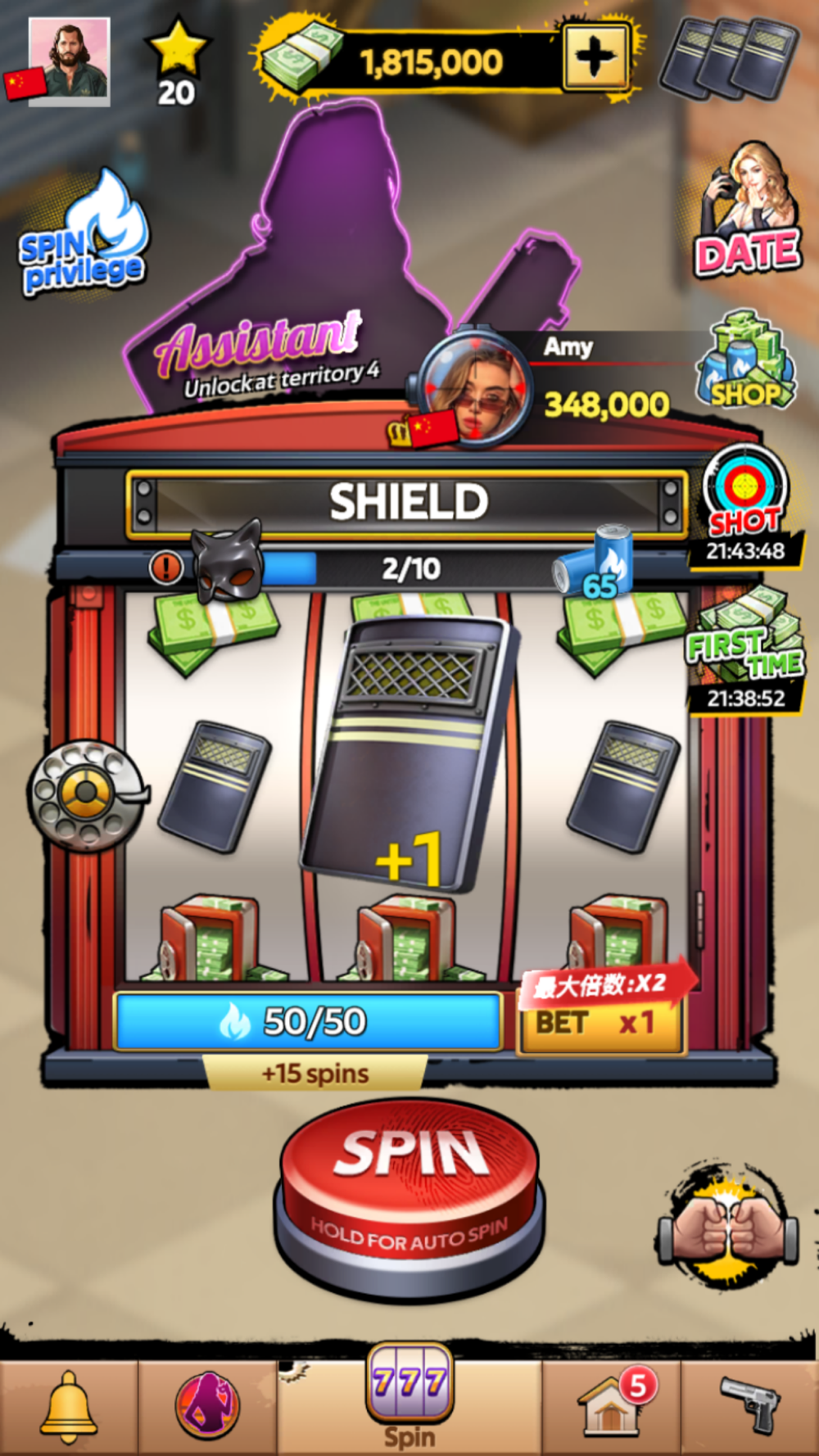 Spin the wheel to fall on your fortune, be it attack time, loot, shields or raids. Win your loot by landing on coins or gold sacks so you can build strong gangs through the game and move up in levels. Win shields to guard your territory from others trying to attack you. Become the Narcos City Master with the strongest territory and the most loot!