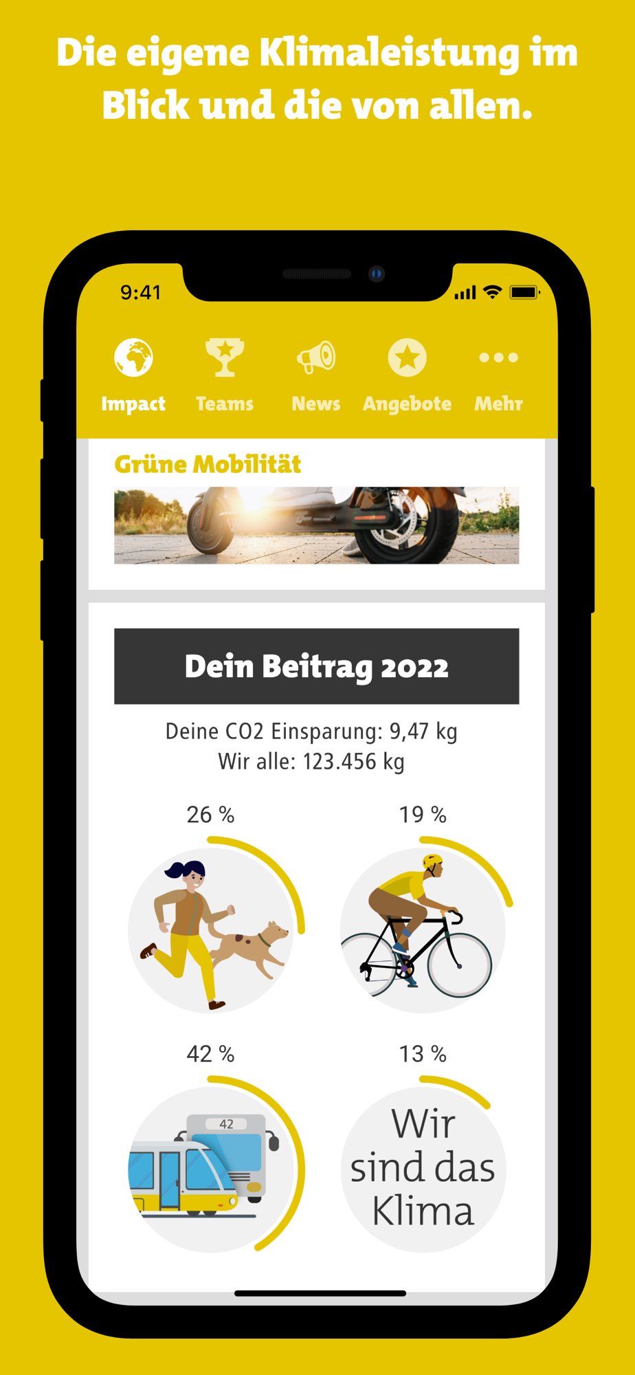 Die App belohnt Dich für Wege, die Du nicht mit dem Auto zurücklegst. Für jede 5 kg CO2, die so vermieden werden, erhältst Du einen wertvollen Klima-Taler. Deine Klima-Taler kannst Du im Marktplatz gegen z. B. Gutscheine oder für Verlosungen eintauschen.