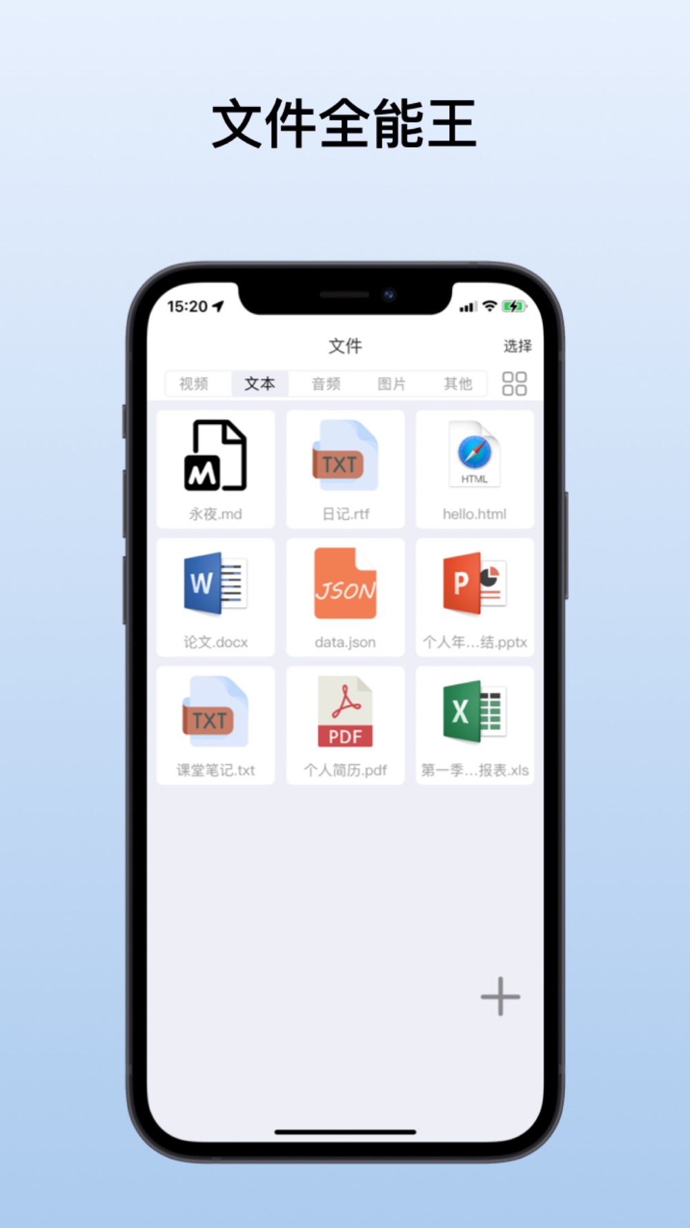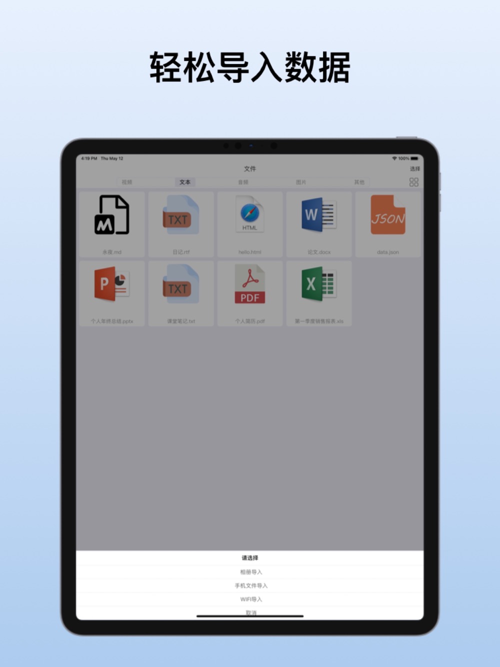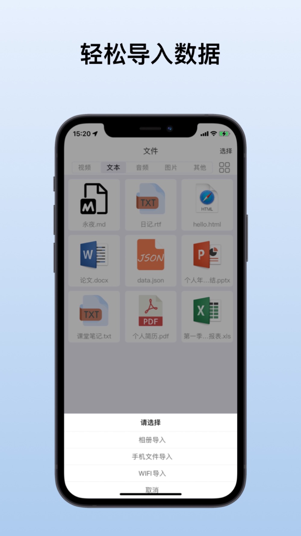 您可以通过相册导入、手机文件导入、WIFI导入这三种方式导入数据,app会自动根据文件类型进行分类展示