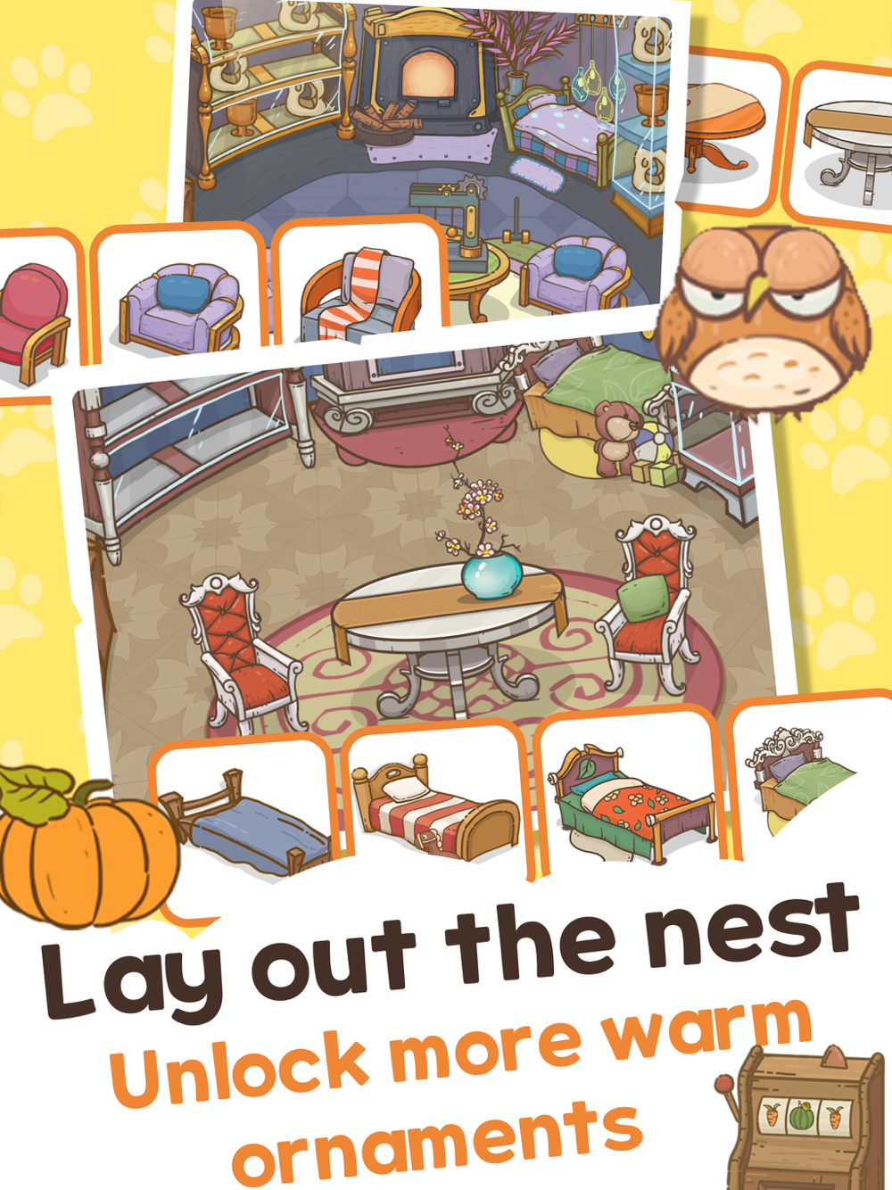 - Wooden House: Choose furniture to decorate the wooden house and make it warm;