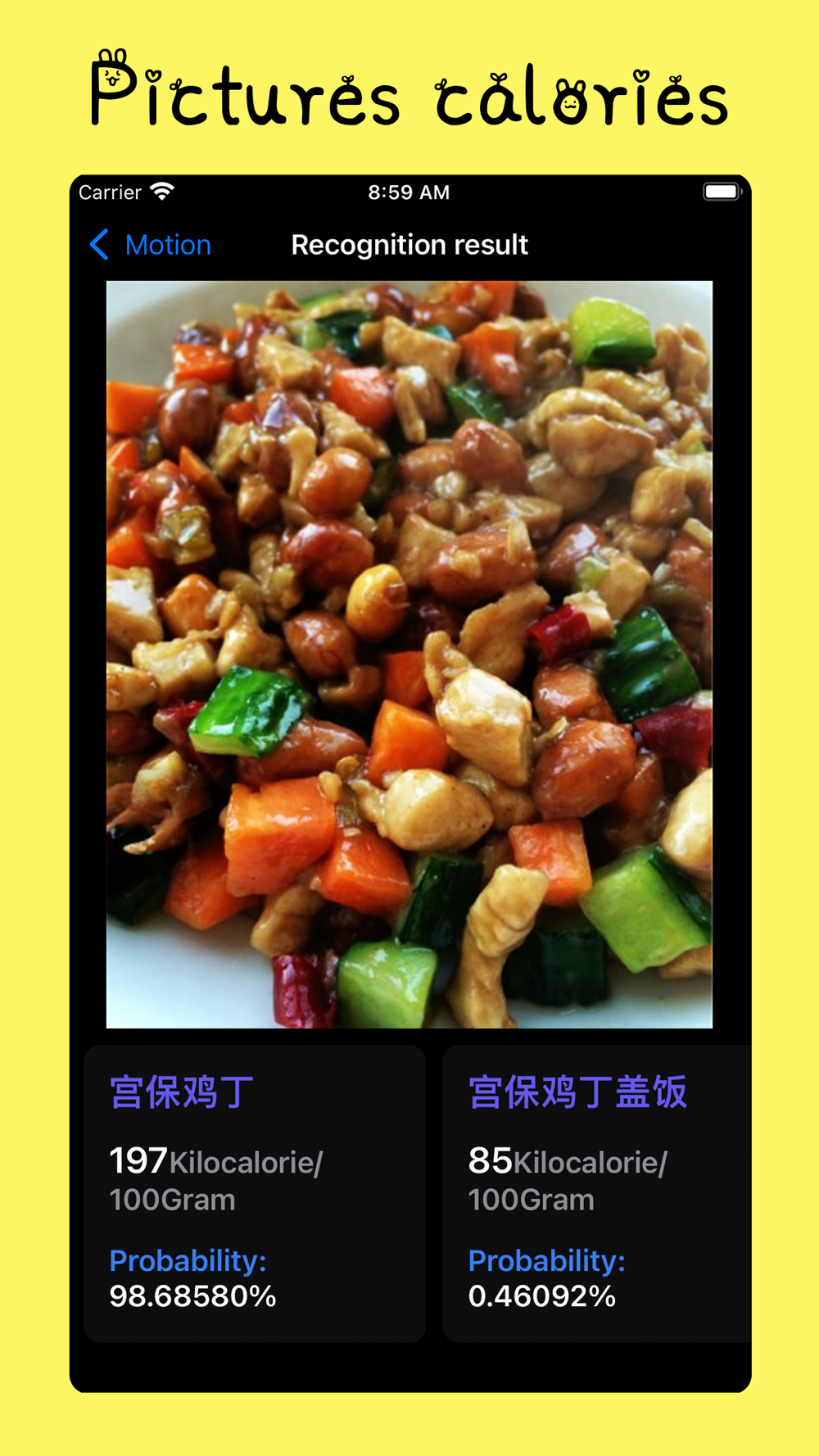 This application can take photos or select pictures from photo albums for real-time analysis to obtain the name and heat information of dishes.