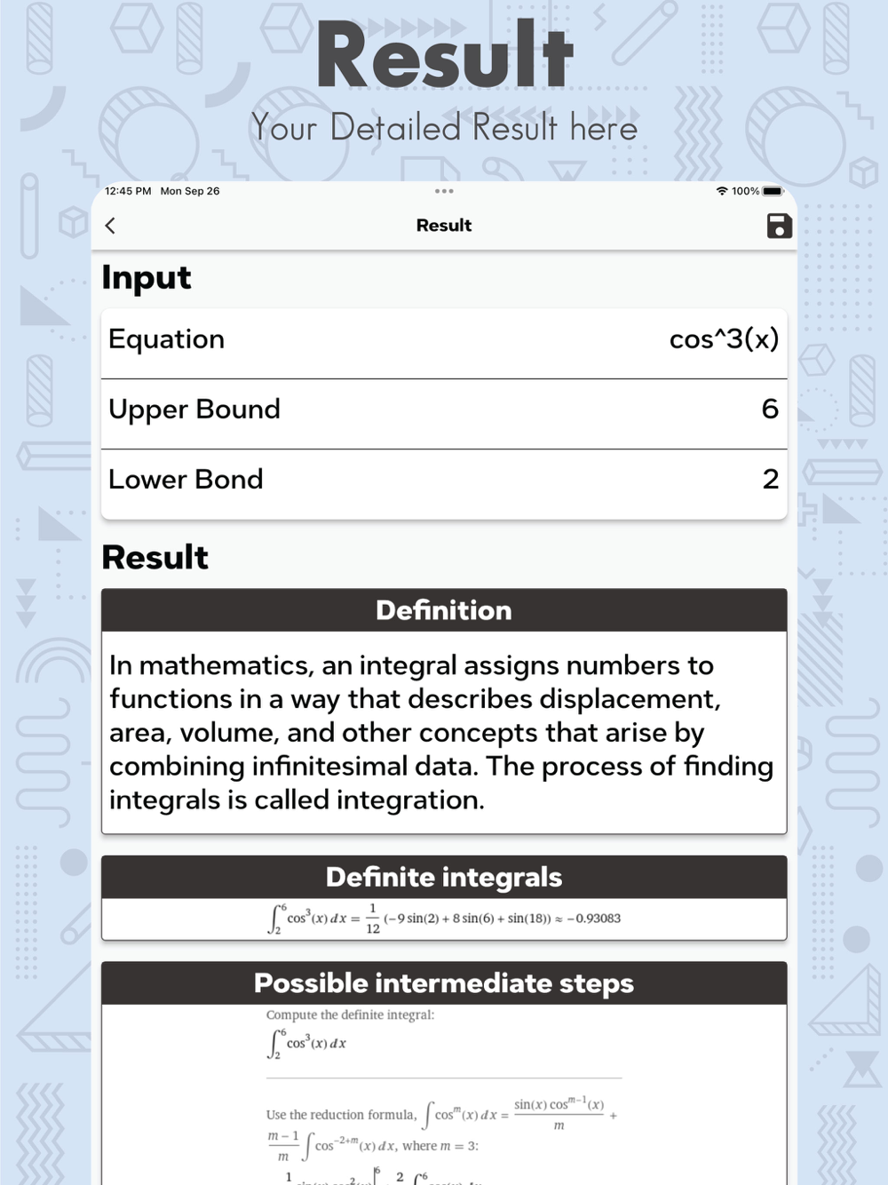 The integral calculus calculator app is user-friendly and easy to navigate. With a simple interface, users can quickly input functions and choose integration limits and methods. The app also provides step-by-step guidance, ensuring that users understand the process of solving integrals.