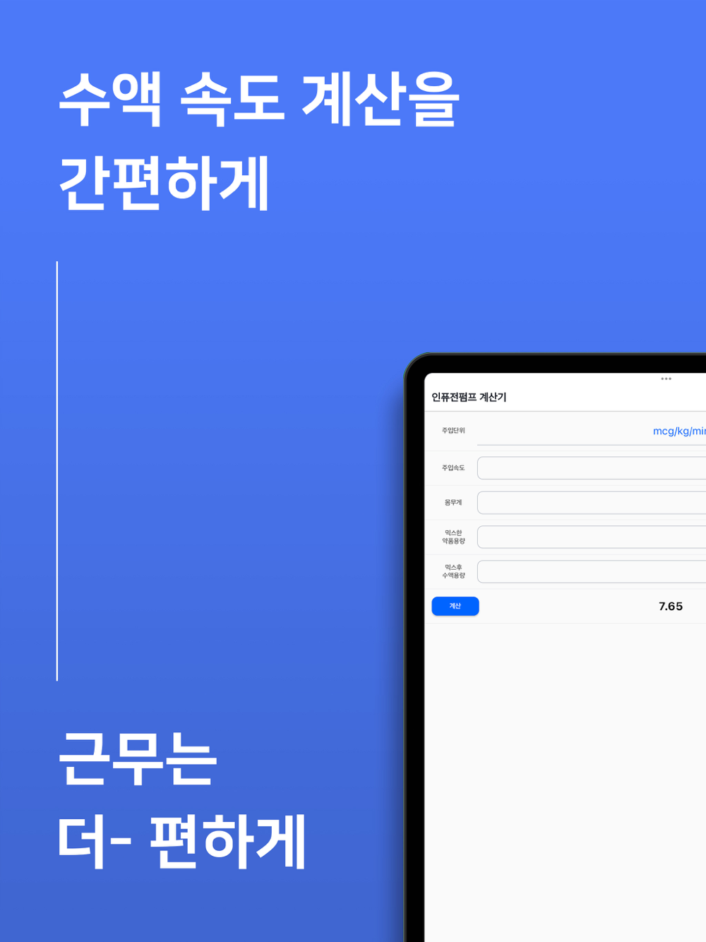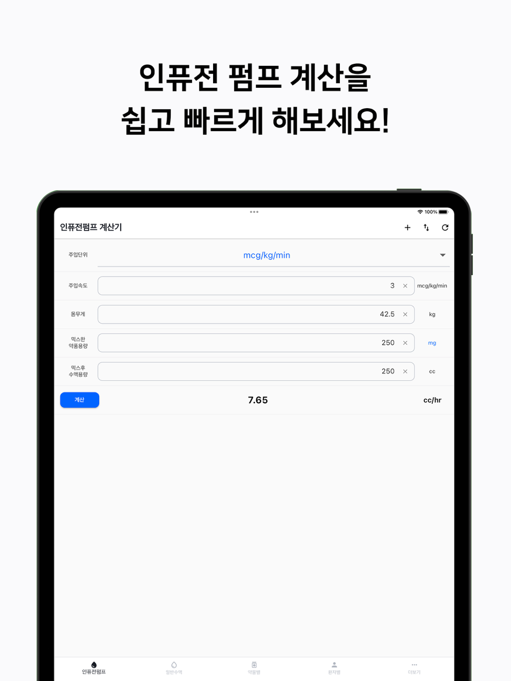 컨티브는 각종 인퓨전 펌프와 수액의 cc/hr, gtt/min 계산을 빠르게 해결해 줍니다.