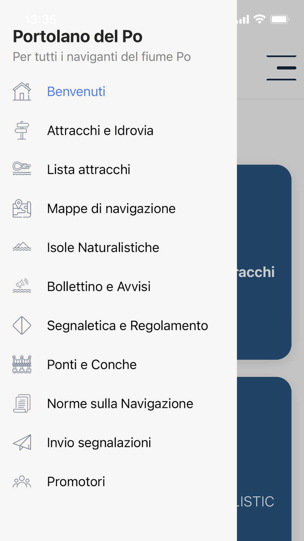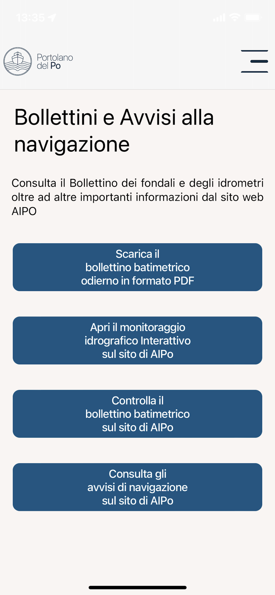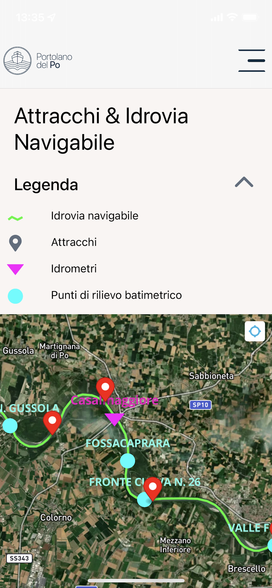 Remember: The captain is solely responsible for maneuvering and navigating the vessel! The app also provides useful references to navigation regulations and the main signage encountered along the Po.