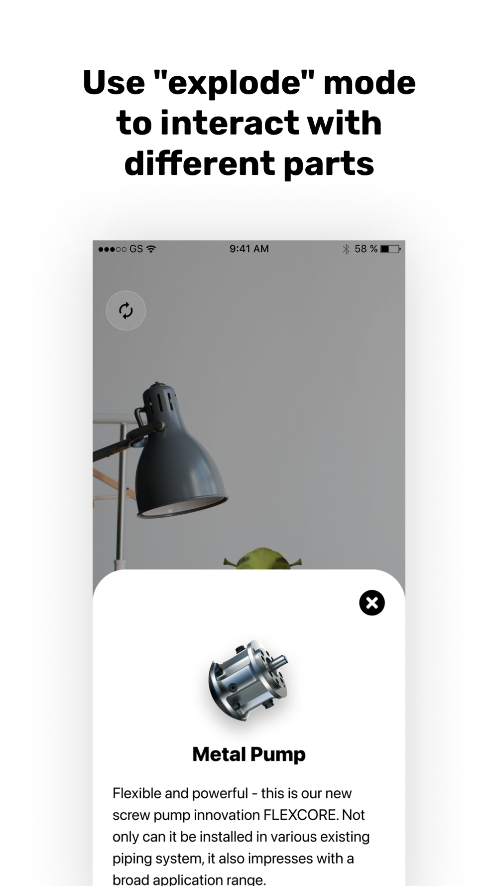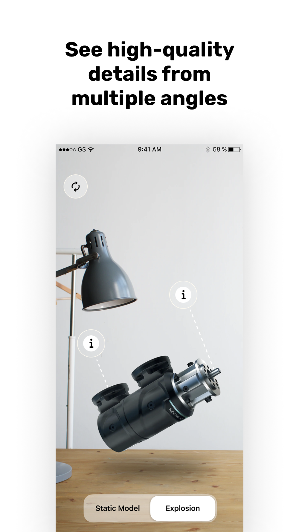 High-quality graphics: The app recognizes your environment and renders a 3D object directly in it. After tapping the “explode” mode, the object splits into separate parts that you can view in detail.
