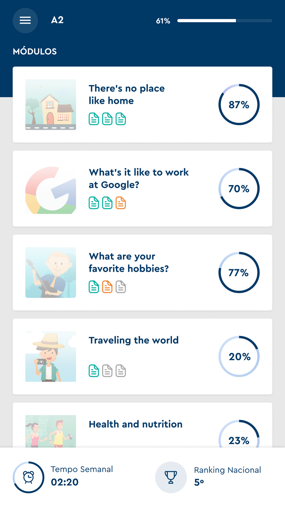 El alumno trabaja las 4 habilidades lingüísticas de manera apasionante y eficiente, priorizando el habla y la escucha en inglés. El habla del alumno es comparada con la pronunciación de más de cien nativos a través de nuestra poderosa herramienta de reconocimiento de voz.