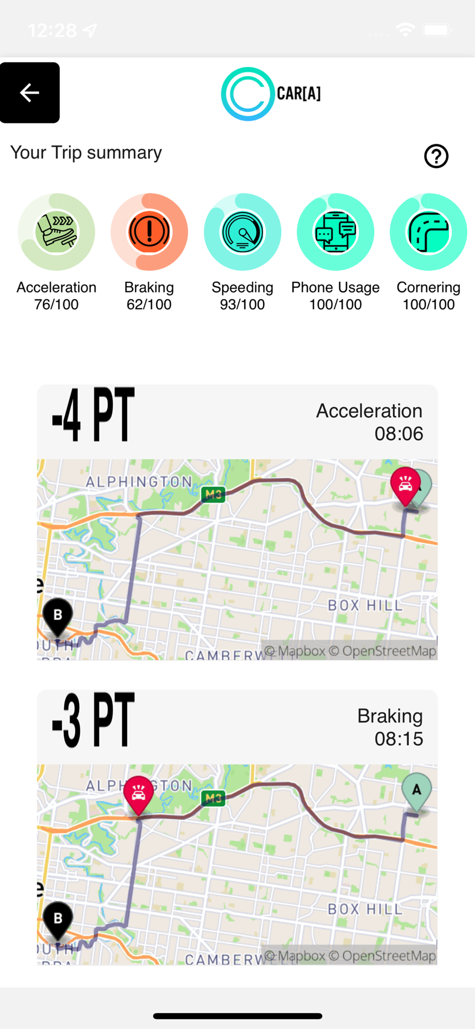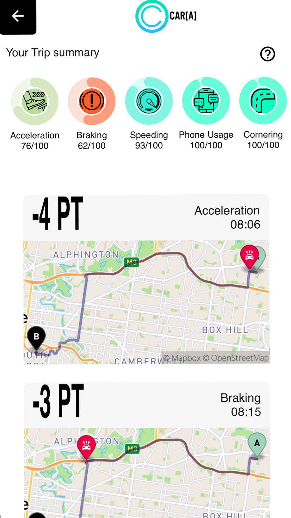 CAR[A] (CAR + ADVANTAGE) is a virtual coach app that digitises the way people drive. The CAR[A] app runs off your mobile and immediately connects with the vehicle and flags the individual weaknesses of the driver. This gives them coaching and insights to be better drivers, helping them understand where they can improve and be motivated to be safer on the road.