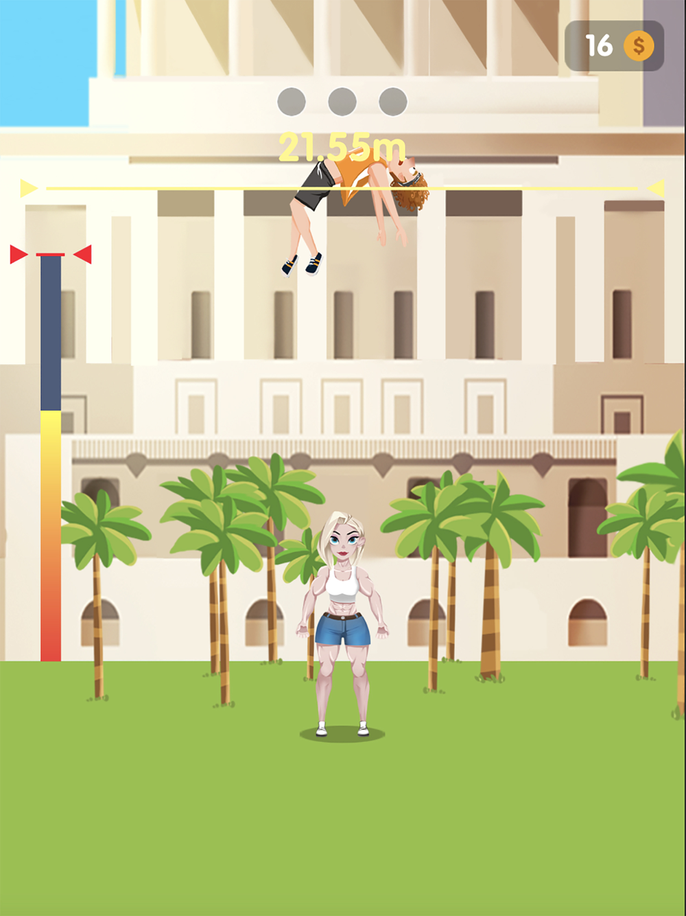 Tap to toss the man in her arms into the air and tap on it again before he falls to the ground.