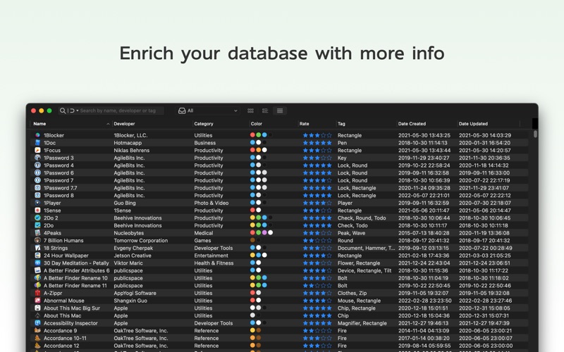 - Filter icons by name, developer, category, tag, and color.