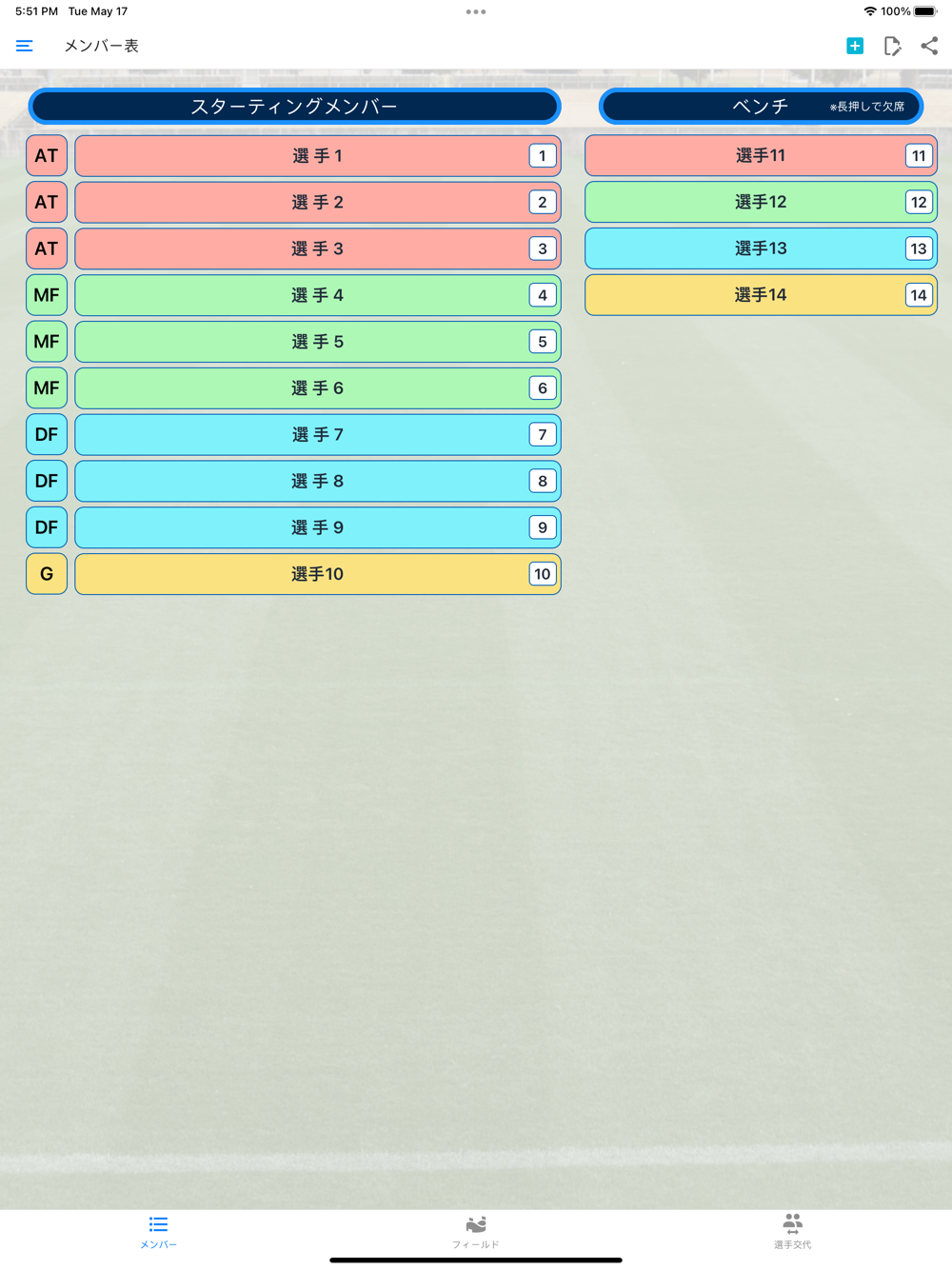・選手の得意ポジション「AT・MF・DF・G」を登録し、選手を色分けできます。