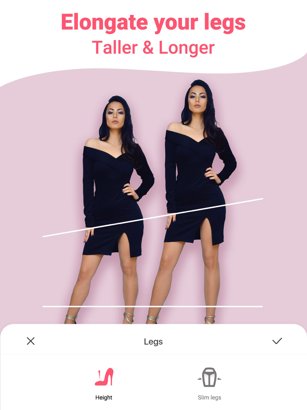 Use the body editor to get thin waist, slim skinny figure. Touch and retouch photo as you like. Our AI body scanner enables you to auto retouch your body. Get long beautiful legs and perfect waist in one tap.