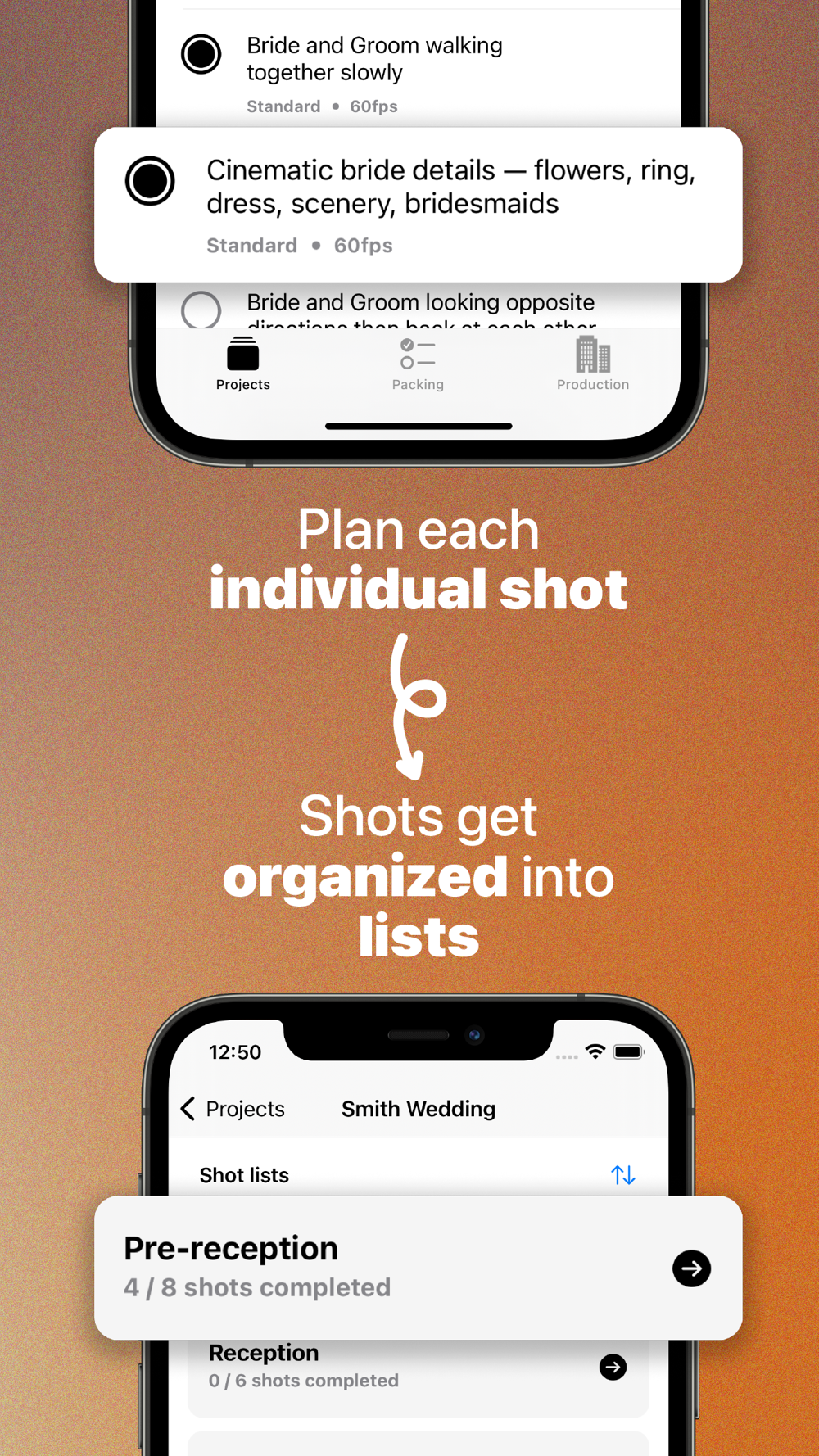 Construct individual lists of specific shots that you need to make happen. Create multiple lists for whatever organization method makes the most sense to you.
