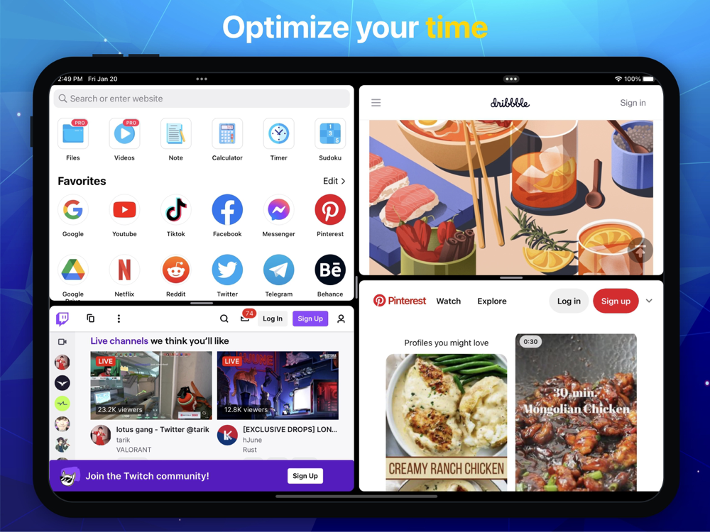 - View 2 browsers (4 browsers on iPad) simultaneously.
