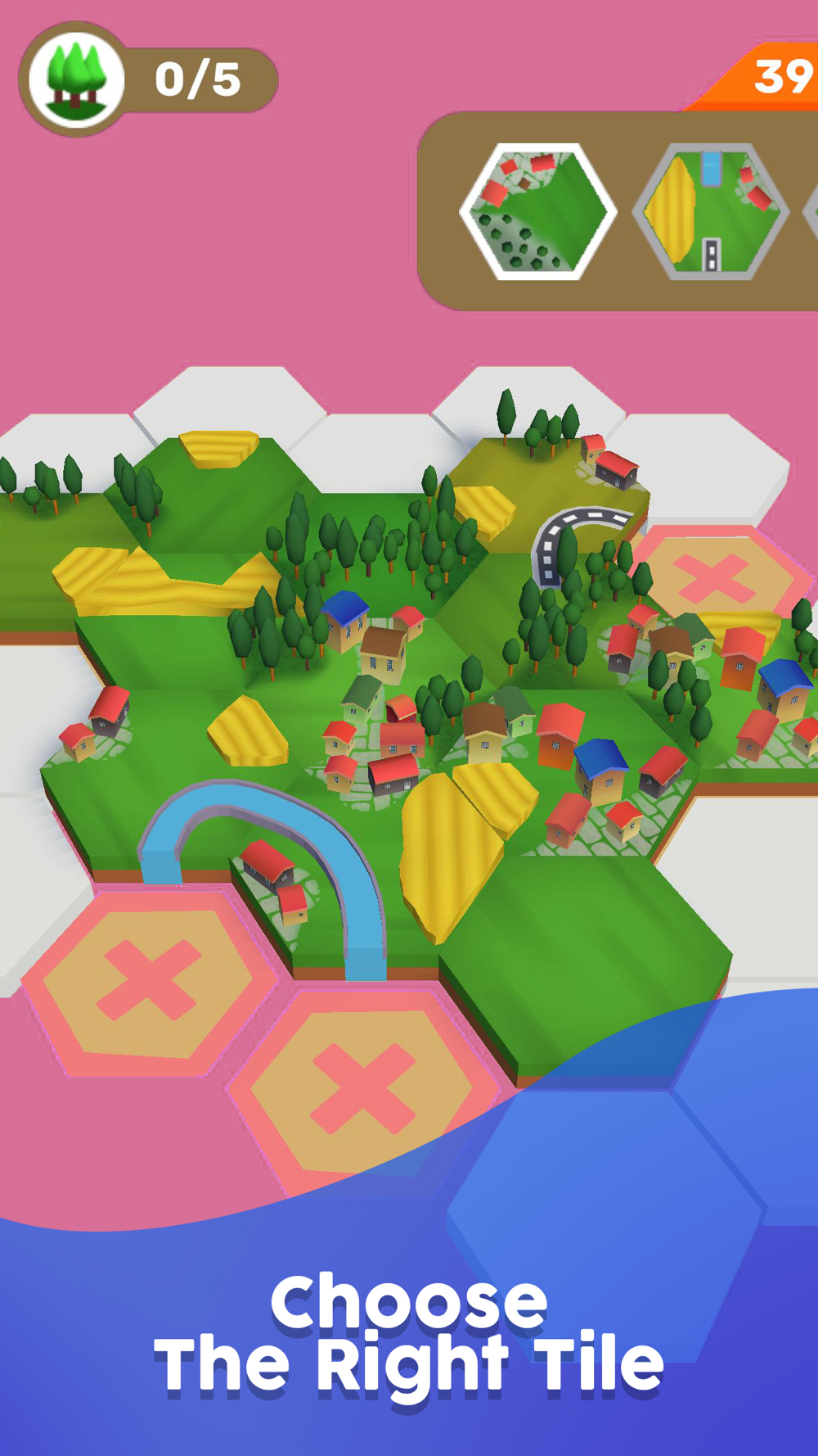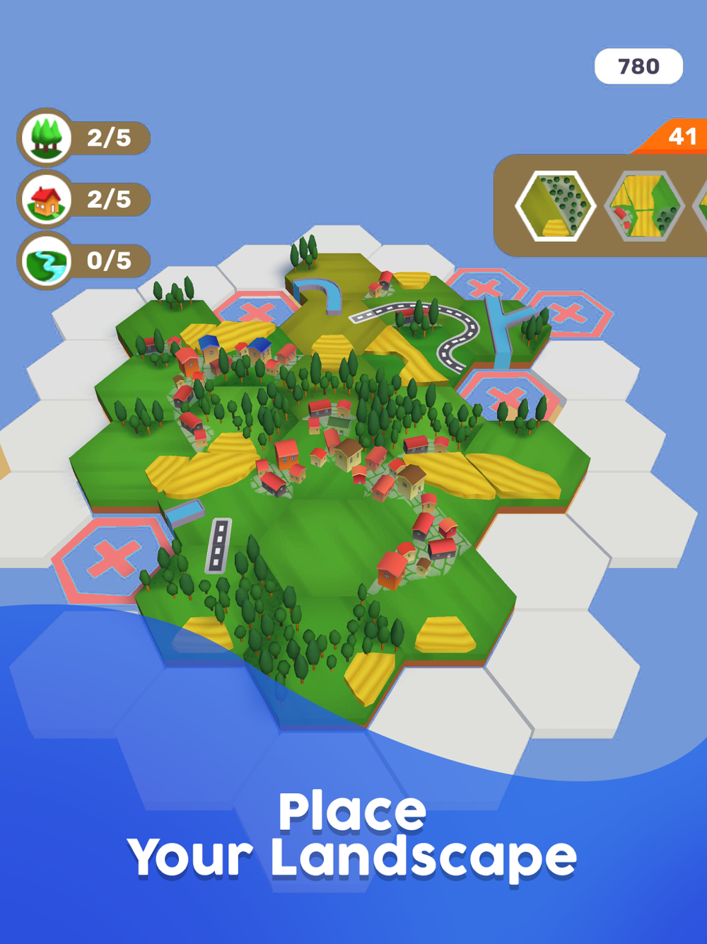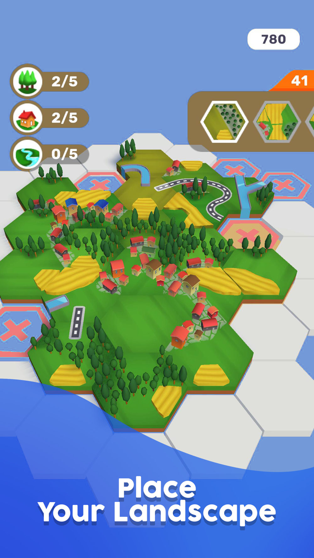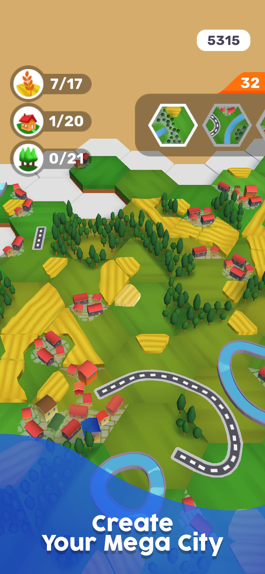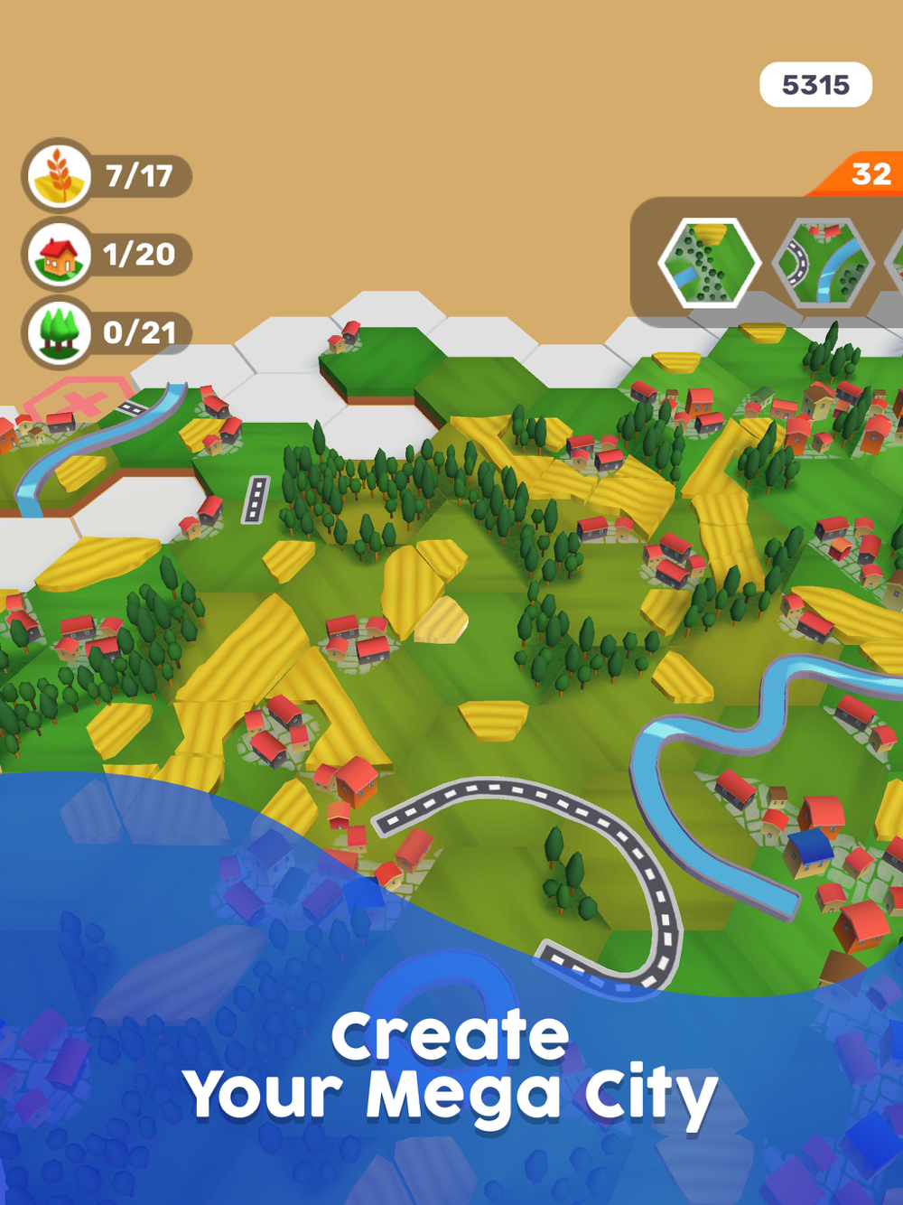 Your City starts with a well formed small area where you will be adding new hexagon tiles one by one. You will rotate and place the tiles by its suitability to the well formed area. As a result, you get points by placing the same areas together to form a mega landscape.