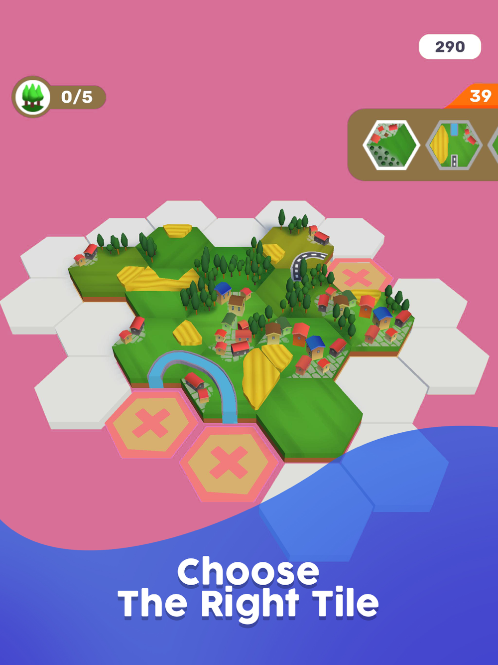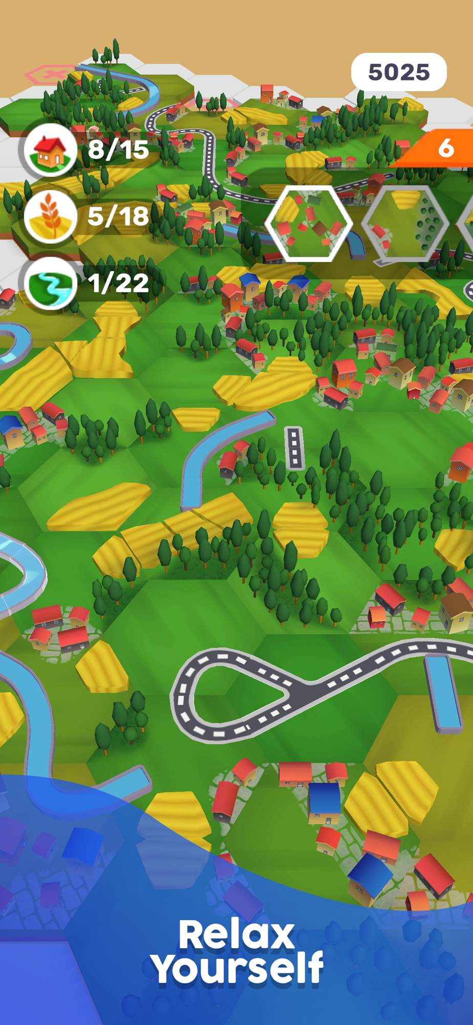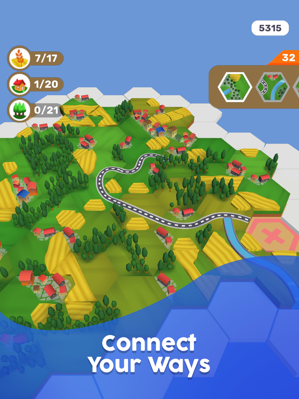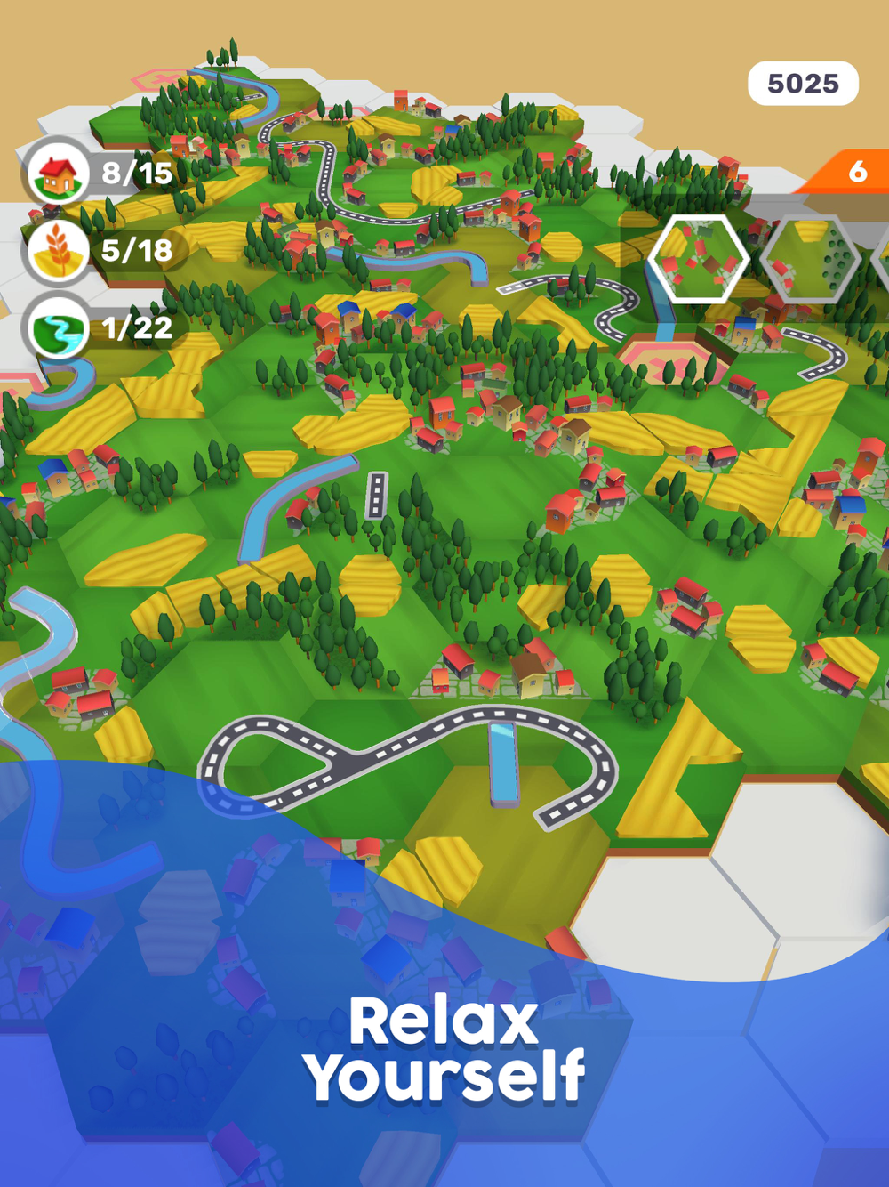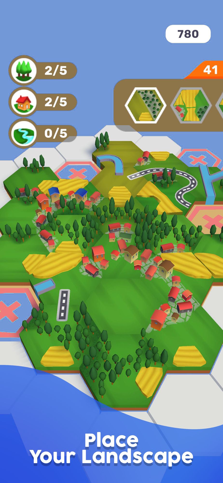 Your City starts with a well formed small area where you will be adding new hexagon tiles one by one. You will rotate and place the tiles by its suitability to the well formed area. As a result, you get points by placing the same areas together to form a mega landscape.