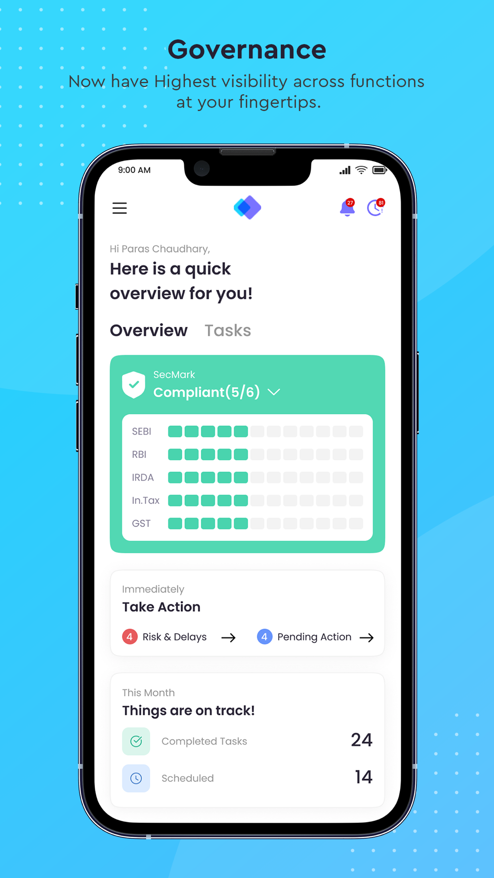 3. Compliance: On time every time. Manage all compliances with dashboards and calendars, review and maker checker system.