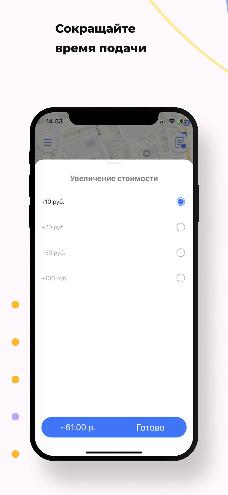 Едете на встречу в час-пик и не получается найти машину? Увеличьте стоимость заказа. Так водитель быстрее заберет ваш заказ во время повышенного спроса.