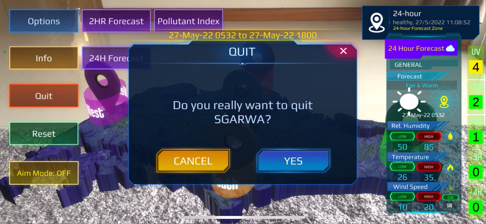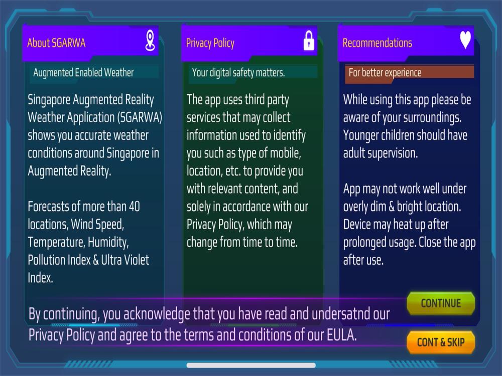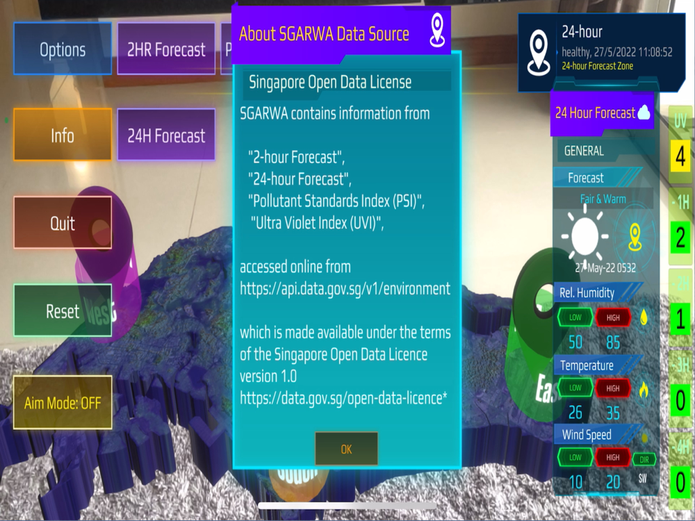 Introducing SGARWA: A beautiful and accurate Weather app that also shows you Weather conditions around you in Augmented Reality. Simply hold your Device up in the direction of the Singapore Map, to see what Weather conditions are like in that area! In addition to Augmented Reality feature, SGARWA includes full Local Weather Forecast and Pollutant Indexes as well. Local Weather includes Current 2H Weather, a 24H Forecast, Ultra Violet Index, Pollutant Standards Index.