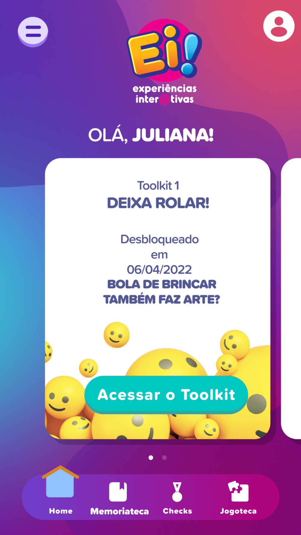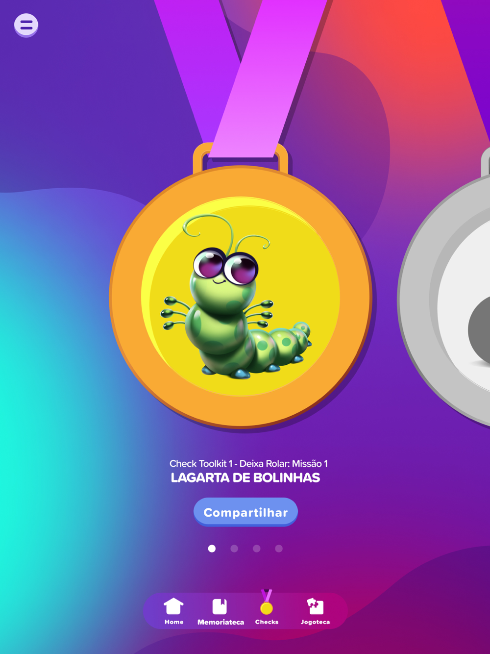 O aplicativo é o suporte para a execução das MISSÕES dos toolkits e também possui algumas atividades extras como a MEMORIATECA e a JOGOTECA, além de permitir que a criança receba conquistas digitais, os CHECKS!