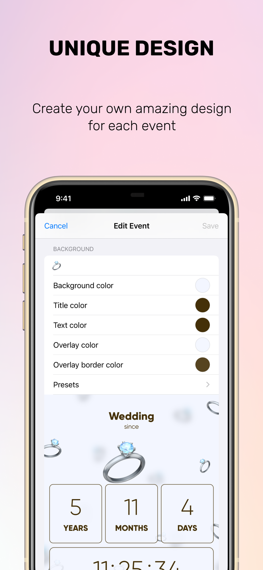 View the remaining days or days elapsed after an event. You can use it to remind you: appointments, anniversaries, birthdays, holidays, exams, wedding, events festivals... customize it.