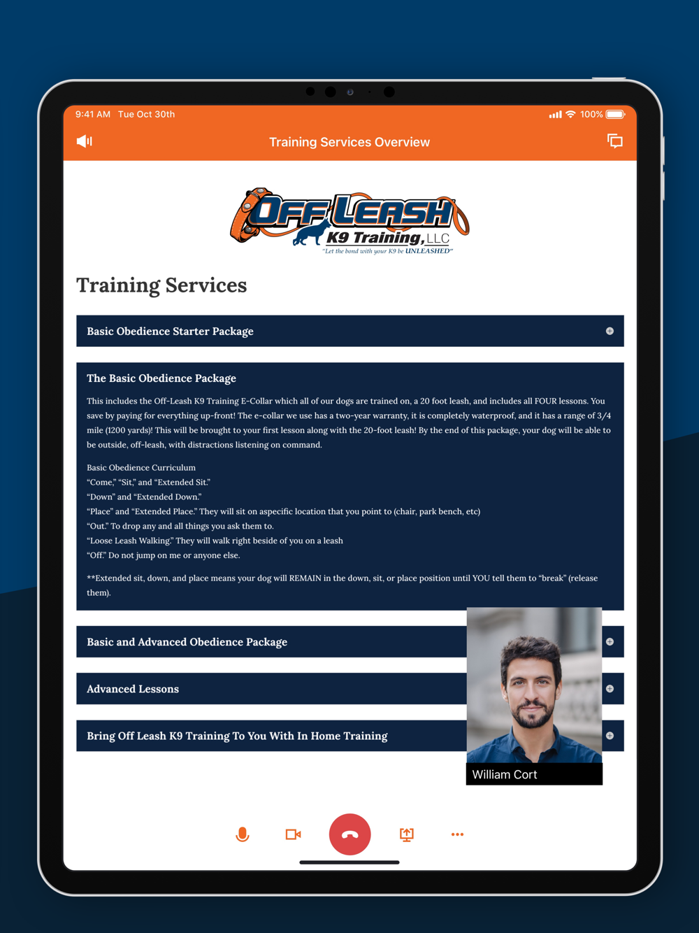Use OLK9 Portal to interact with our team through text, audio, and video messaging. OLK9 Portal allows you to receive real-time updates throughout various dog training processes, including remote training sessions, lesson plans, and more.