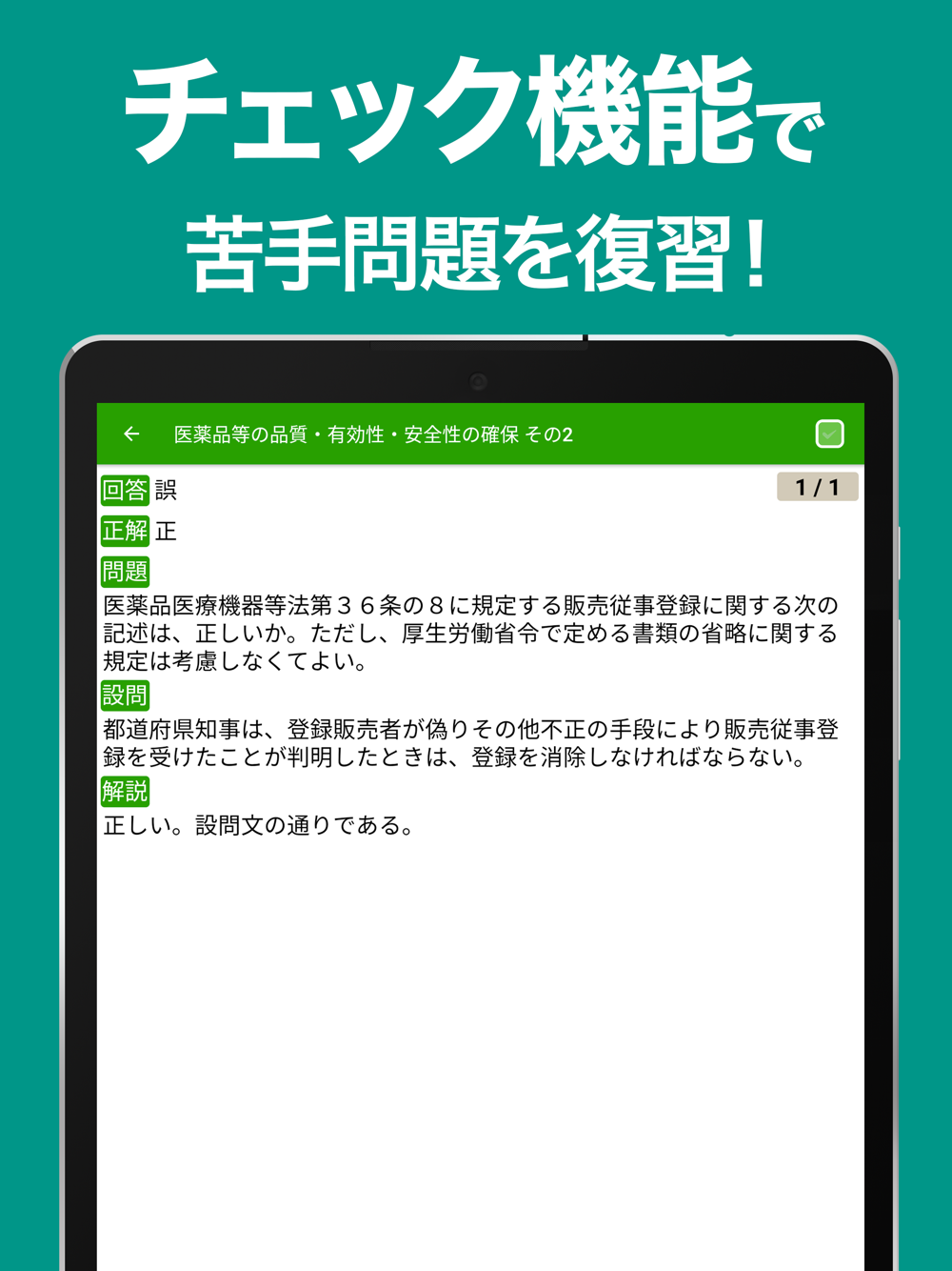 本アプリ「登録販売者 過去問 - 分野別一問一答と本番形式演習」は、