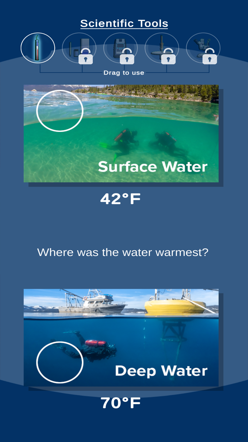 You will receive scientific tools along the way to help you better understand the clues you are finding and get you closer to finding Tahoe Tessie, these tools act as 3D/AR learning experiences teaching you how these tools actually work, just like actual scientists use when researching the health of the lake.