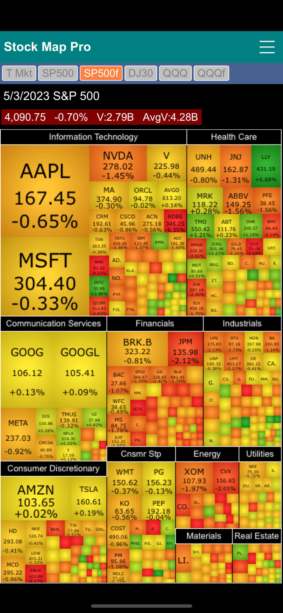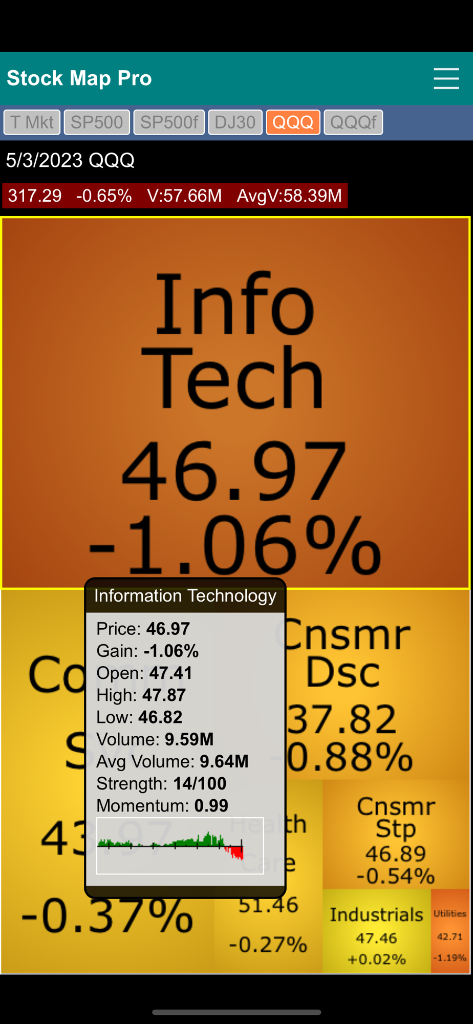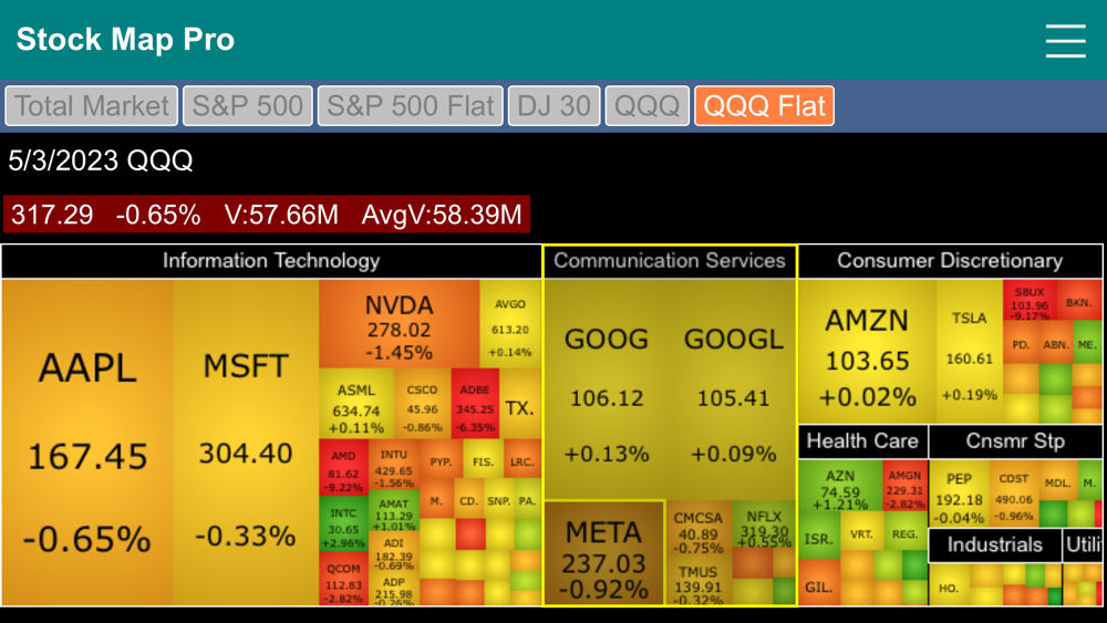 Stock Market Map Professional Edition (Stock Map Pro) contains six stock market heat maps in one app. It features the Total Market map, S&P 500 two-level map, S&P 500 flat map, Dow Jones 30 Industrial map, QQQ two-level map and QQQ flat map.