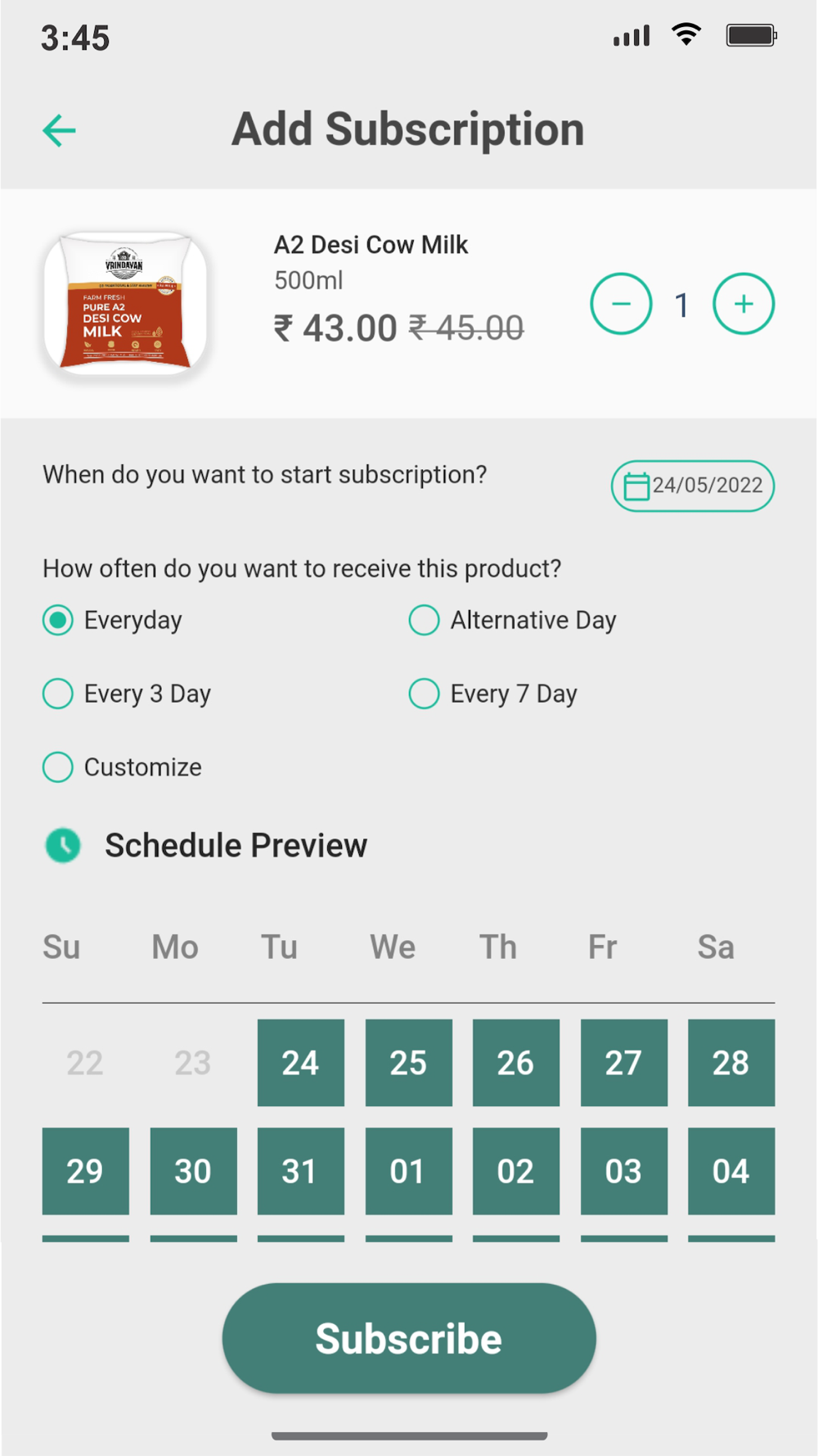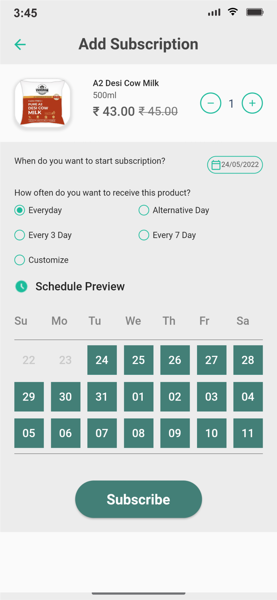 We deliver these fresh products everyday to your home with easy to use mobile app. You can set up a subscription for certain daily essential products such as milk and curd and leave the rest to us. Our dedicated delivery team will bring these products everyday to your home. You can also easily pause and resume subscriptions as and when needed. In addition to the subscriptions, you can also purchase products whenever you need them. Just place the orders in the app, you will get them the next morning at your door steps.