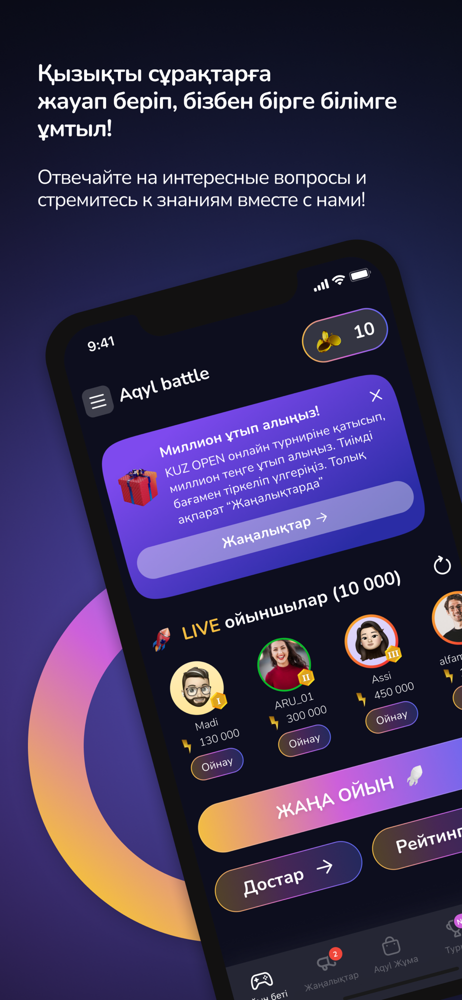 Миллионға жуық қазақстандық ойнап жатқан еліміздегі ең танымал интеллектуалды ойын AQYL BATTLE-ға қош келдіңіз! Өз біліміңізді тексеріп, өзгелермен жарысуға дайынсыз ба?