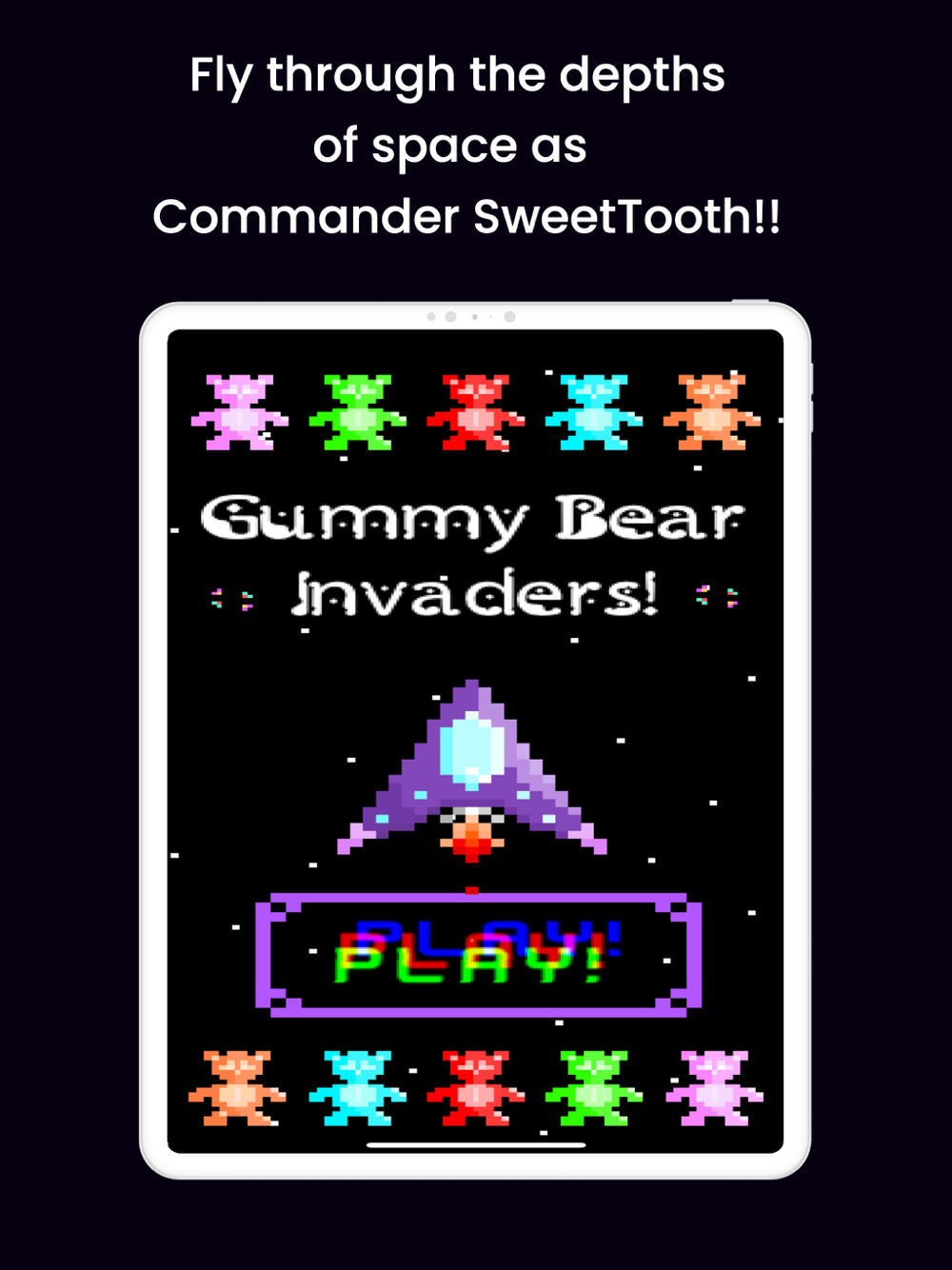 Fly through the depths of space as Commander SweetTooth. Pilot your trusty ship, Stardust, and defend the galaxies near and far from the Gummy Bear invaders! Their hunger for anything and everything has caused whole star systems to vanish into nothingness so it's up to you to defeat their gummy sweetness!