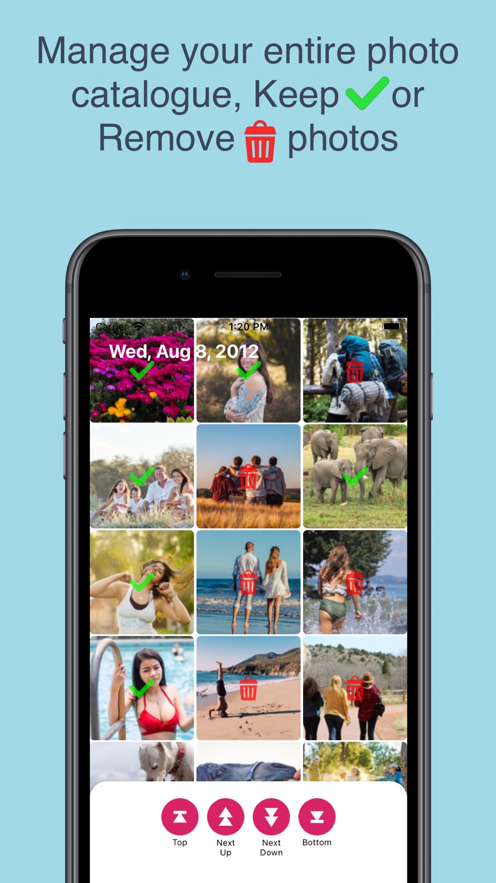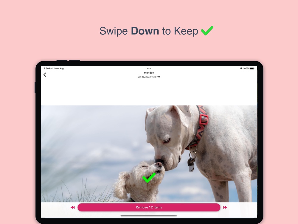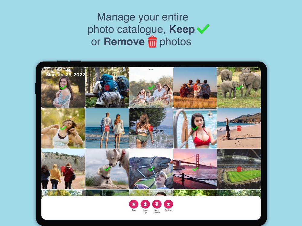 PhotoSweep provides a simple interface - swipe up to remove, swipe down to keep, enabling you to quickly work through your entire library identifying photos for removal, and then remove with a single click.
