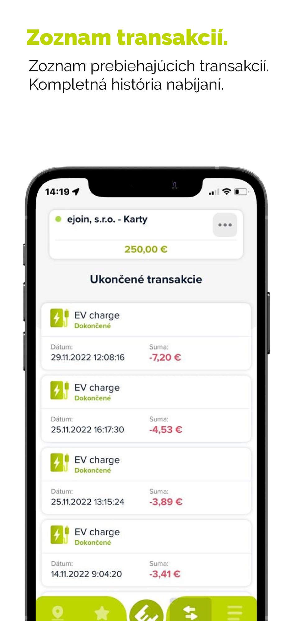 Follow the charging process directly in the application. A perfect overview of charging with information on the current charging power, battery state of charge in percentage or delivered energy. Including history of all your transactions with price, length or location of charging.