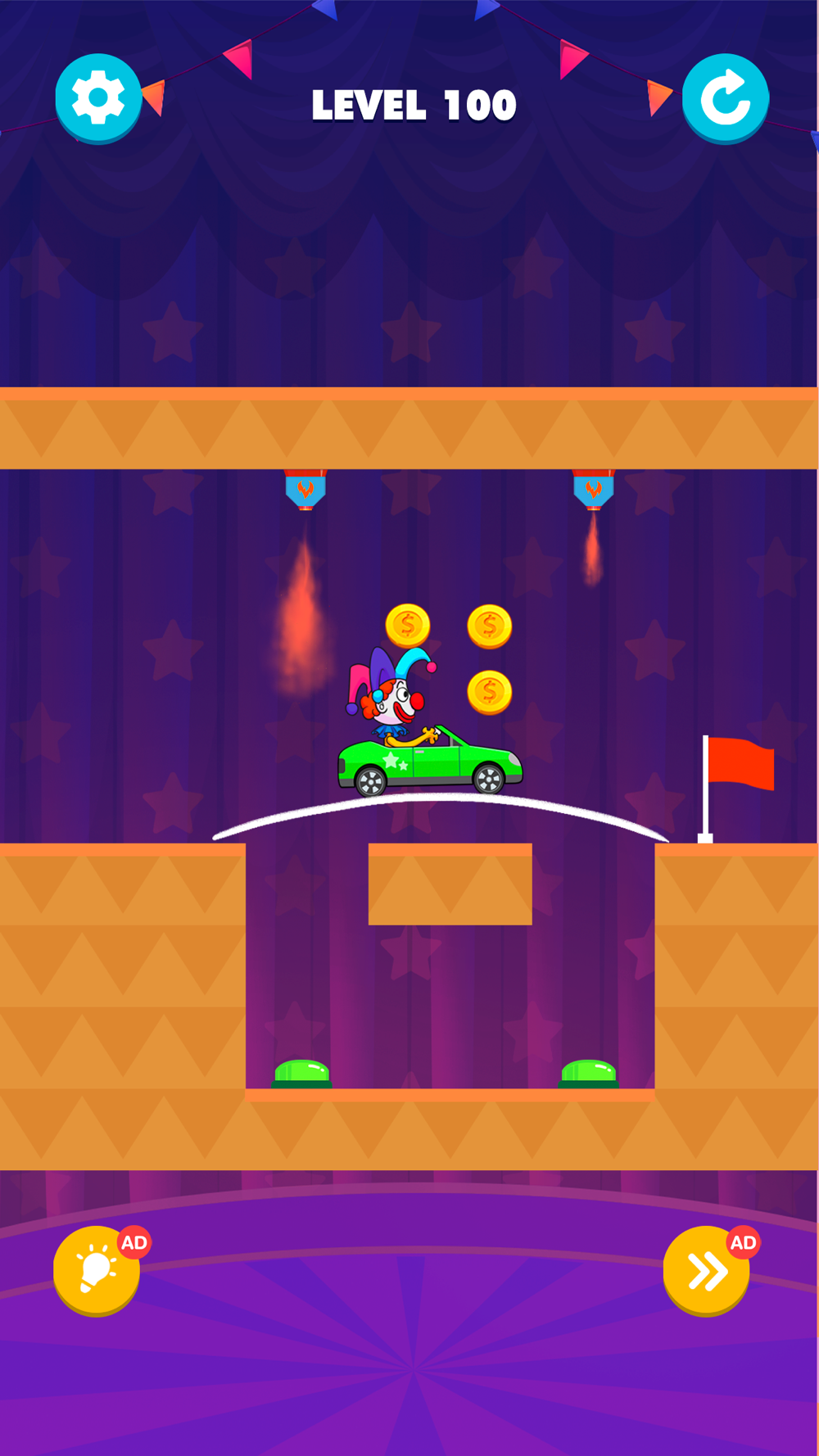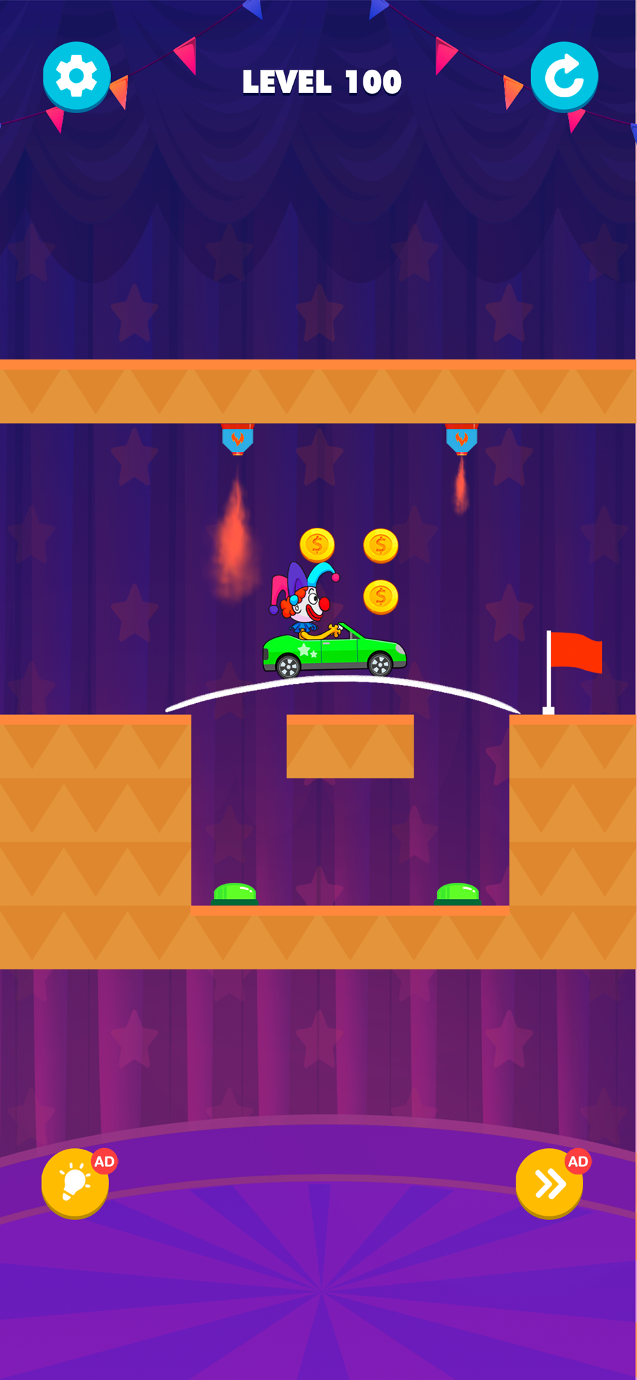 Can the car and the clown make it to the finish line? It all depends on your intelligence and ingenuity! Use brush strokes to make the bridge stronger. You can only draw the line once, be careful not to damage the car, stay away from the dangers! The difficulty of Puzzles & Car will increase through the levels, hundreds of levels are waiting to challenge you.