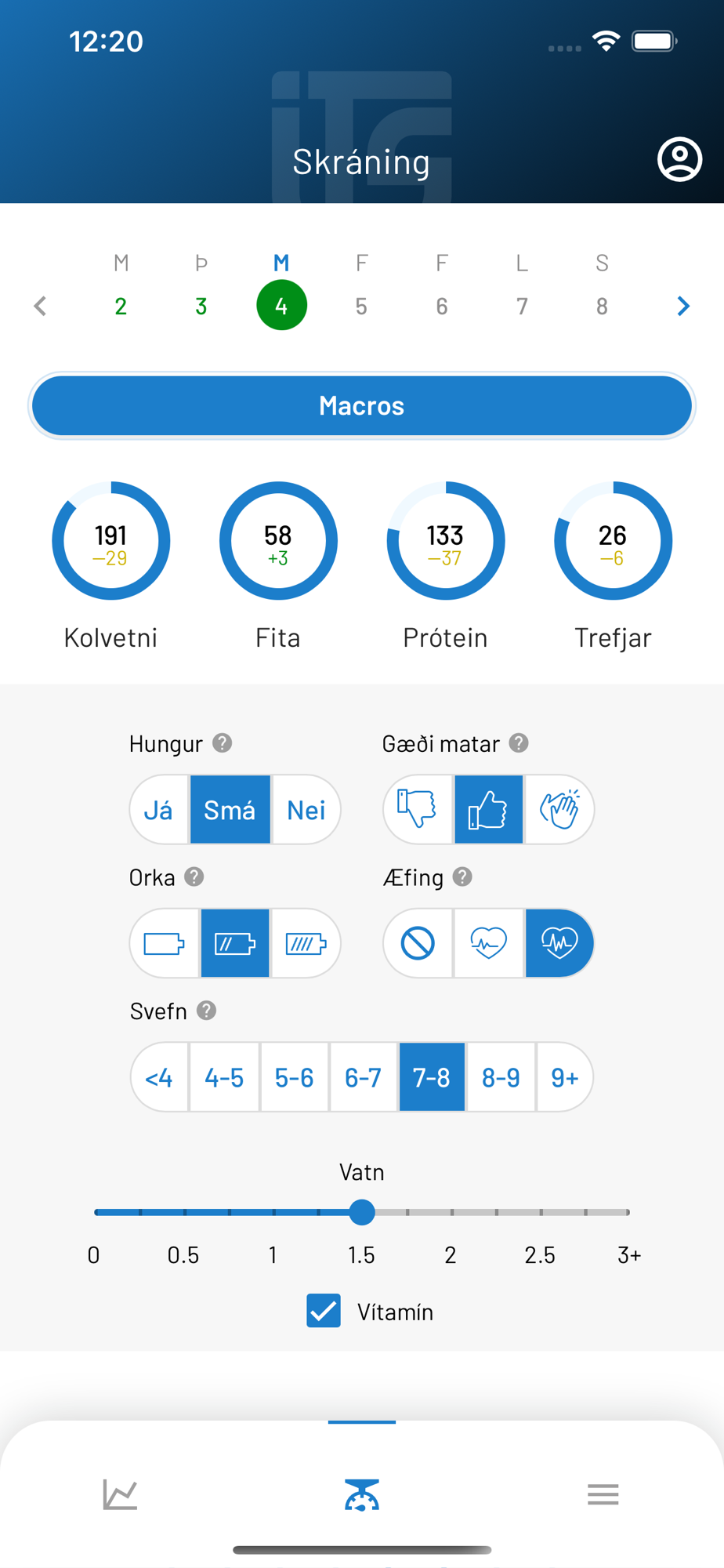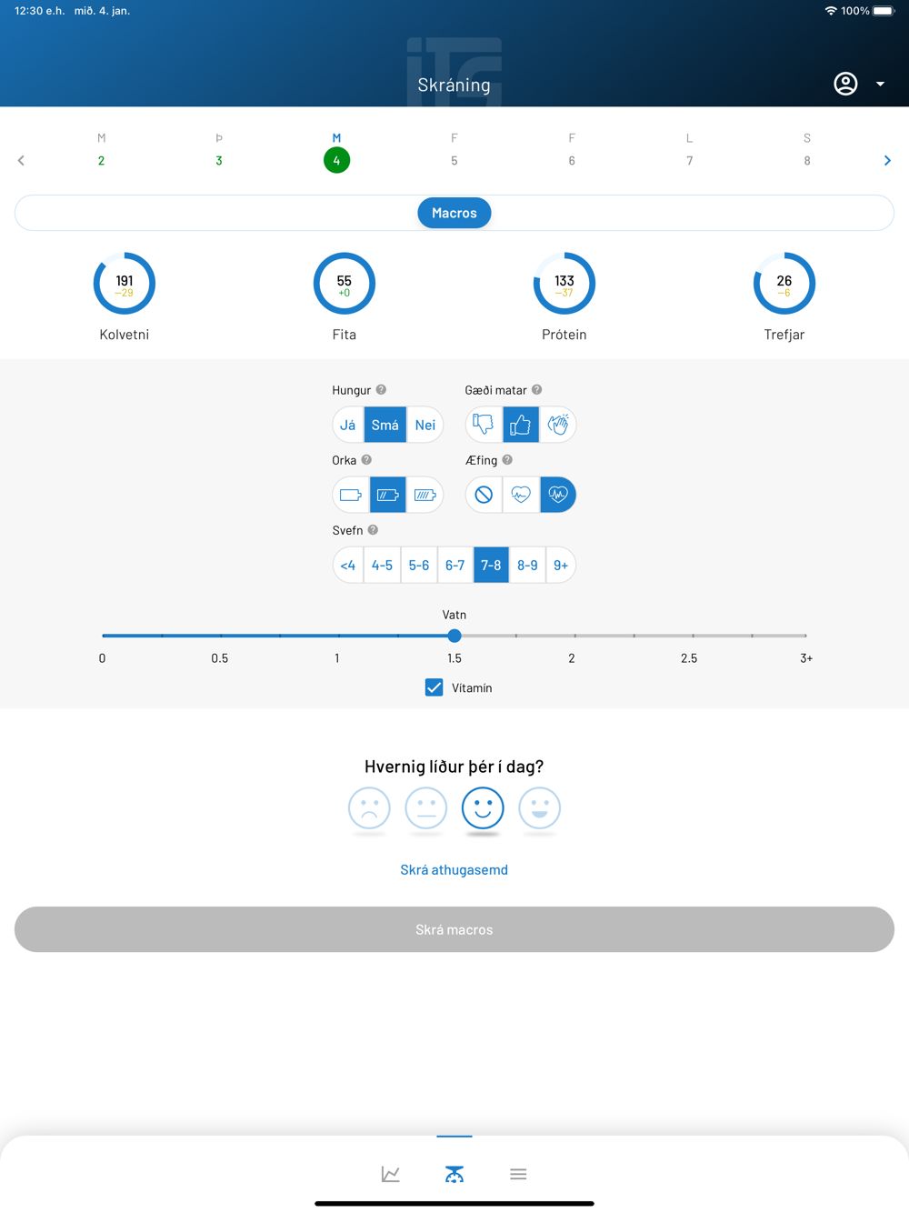 ITS Macros' main goal is to provide personal nutrition coaching. In the app, users can submit daily nutritional metrics for their food intake and get feedback from coaches. Users can log other health metrics such as weight and body measurements.